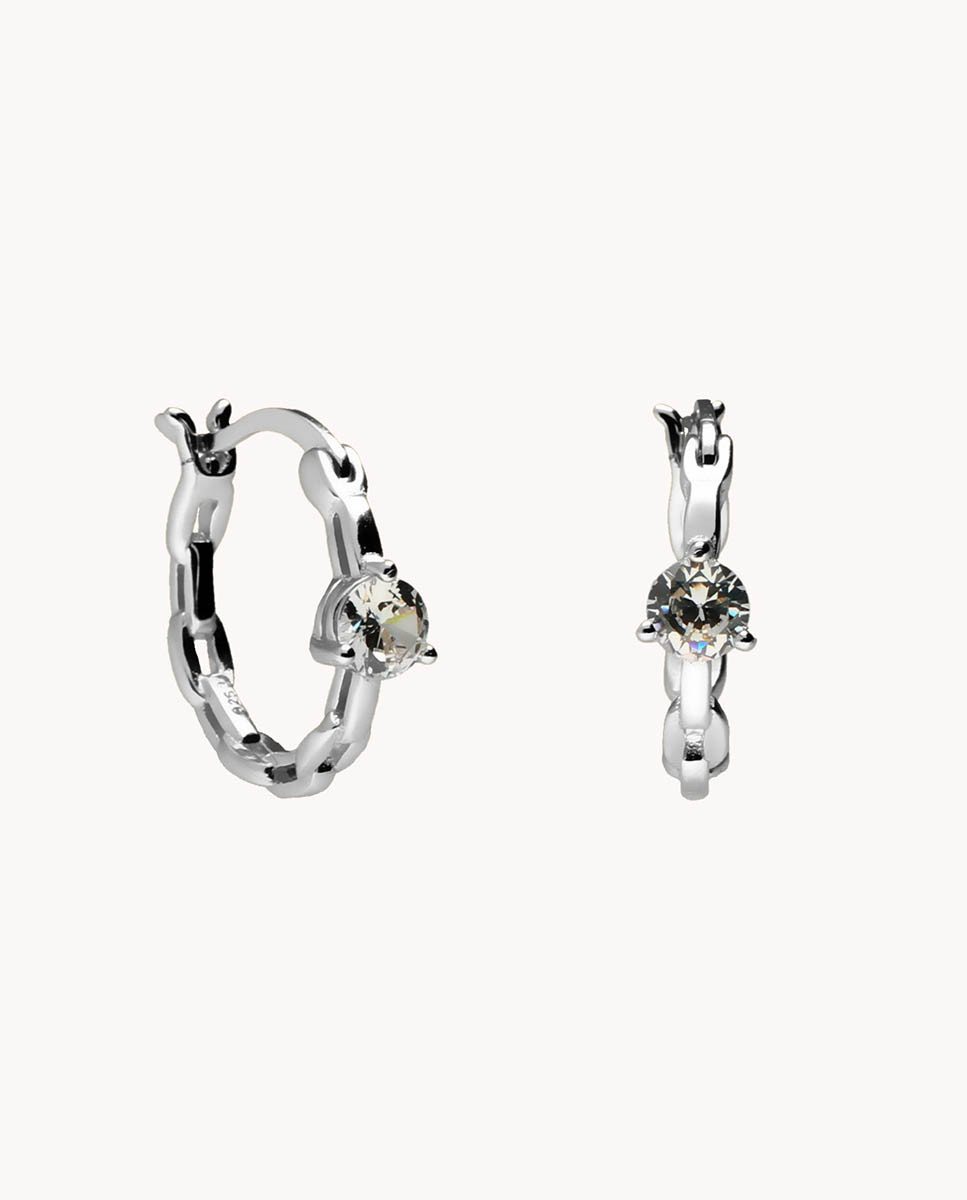 Pendientes de aro de plata de ley 925 bañados en rodio de 12 mm de diámetro interior con eslabones y circonita central de 4 mm de diámetro, cierre catalán.