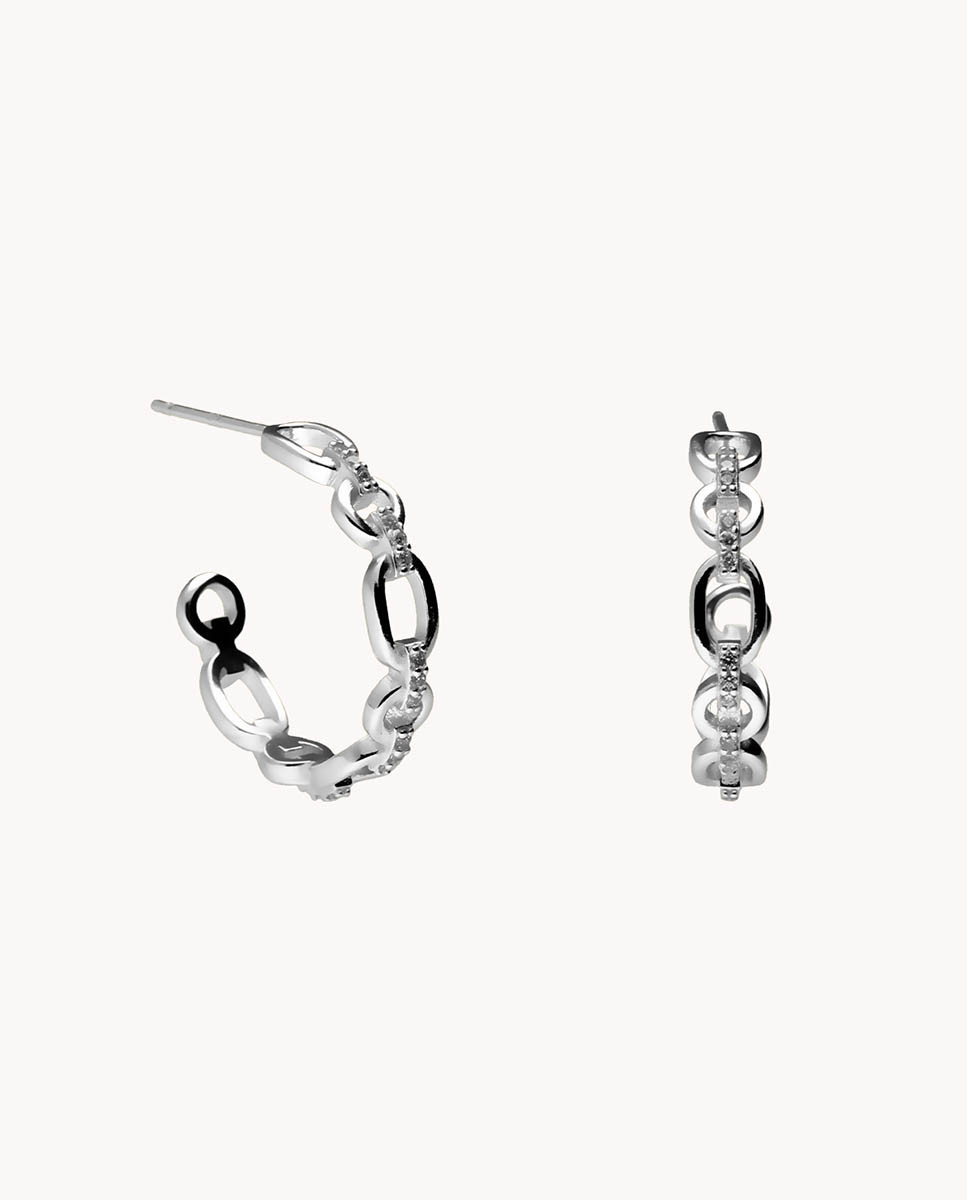 Pendientes de aro de plata de ley 925 bañados en rodio de 17 mm de diámetro interior con eslabones y circonitas blancas, cierre de presión.