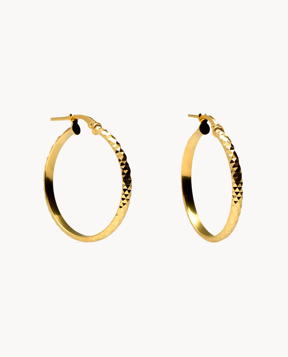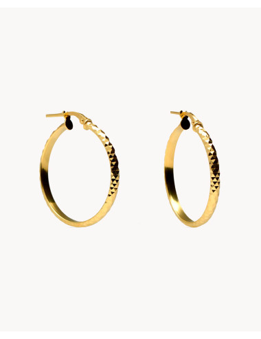 Pendientes de aro de plata de ley 925 bañados en oro de 20 mm de diámetro interior y 3 mm de ancho, con diseño lapidado y cierre catalán.