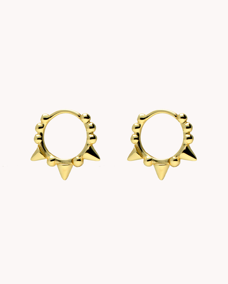 Pendientes de aro de plata de ley 925 bañados en oro de 10 mm de diámetro interior y 3 mm de ancho, detalles de pinchos y bolas, cierre africano.