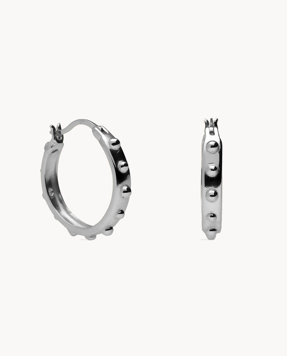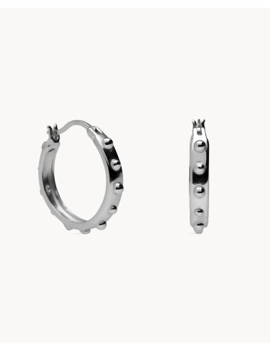 Pendientes de aro de plata de ley 925 bañados en rodio de 15 mm de diámetro interior y 4 mm de ancho, con detalle de clavos y cierre catalán.