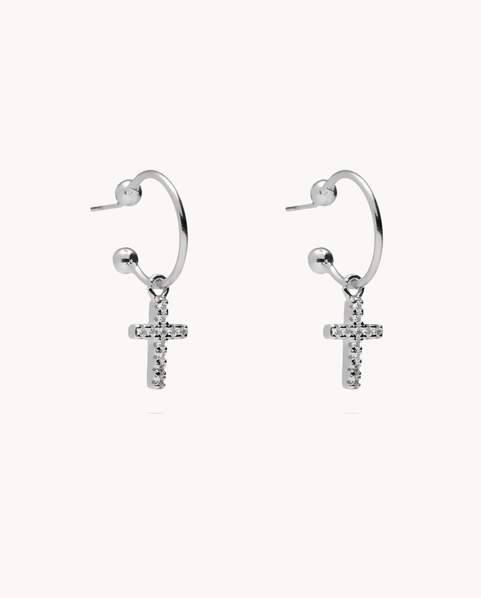 Pendientes de aro de plata de ley 925 bañados en rodio con cruz y circonitas
