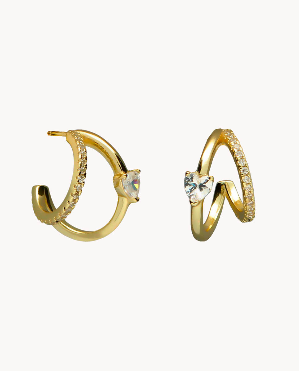 Pendientes de plata de ley 925 bañados en oro con doble aro, uno de circonitas blancas y otro con una circonita central en forma de corazón de 4 mm x 4 mm (ancho por alto), cierre de presión.