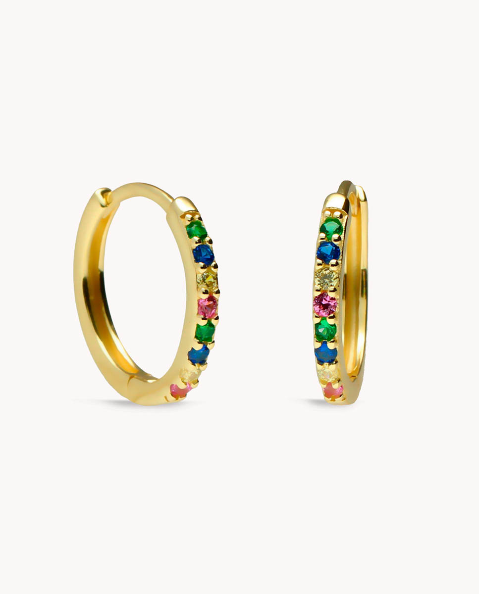 Pendientes de aro de plata de ley 925 bañada en oro 18K de 12 mm de diámetro (interior) y 2 mm de ancho y circonitas multicolor, cierre africano.