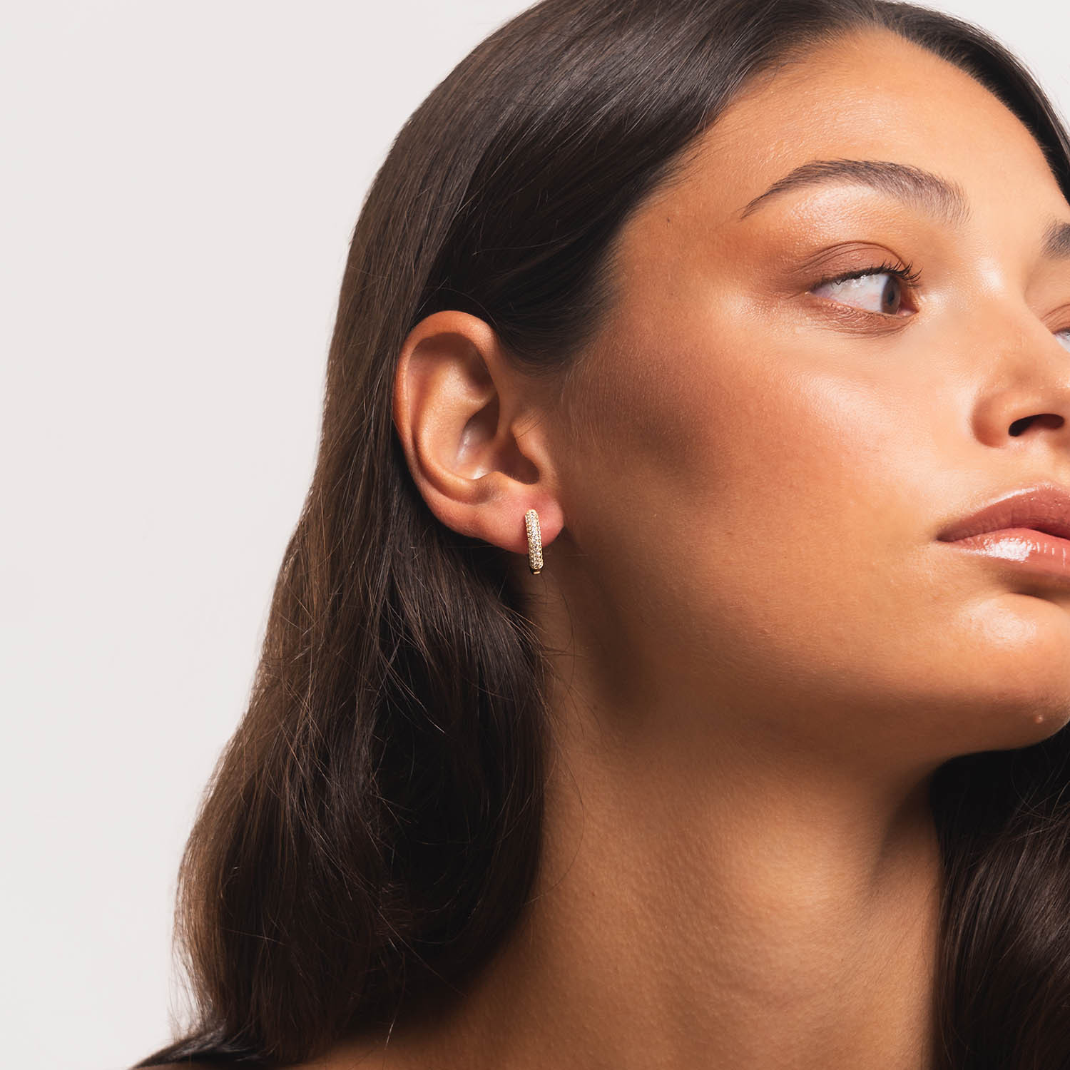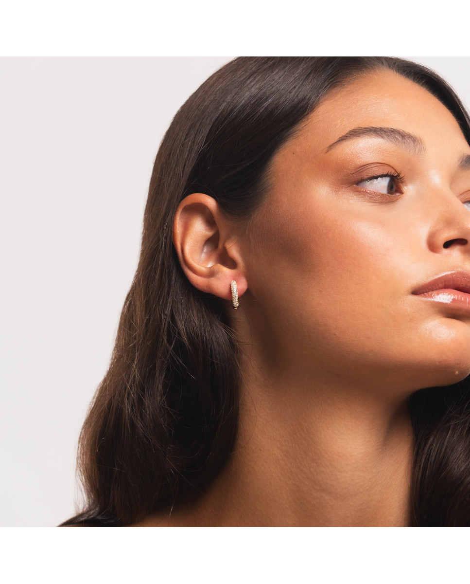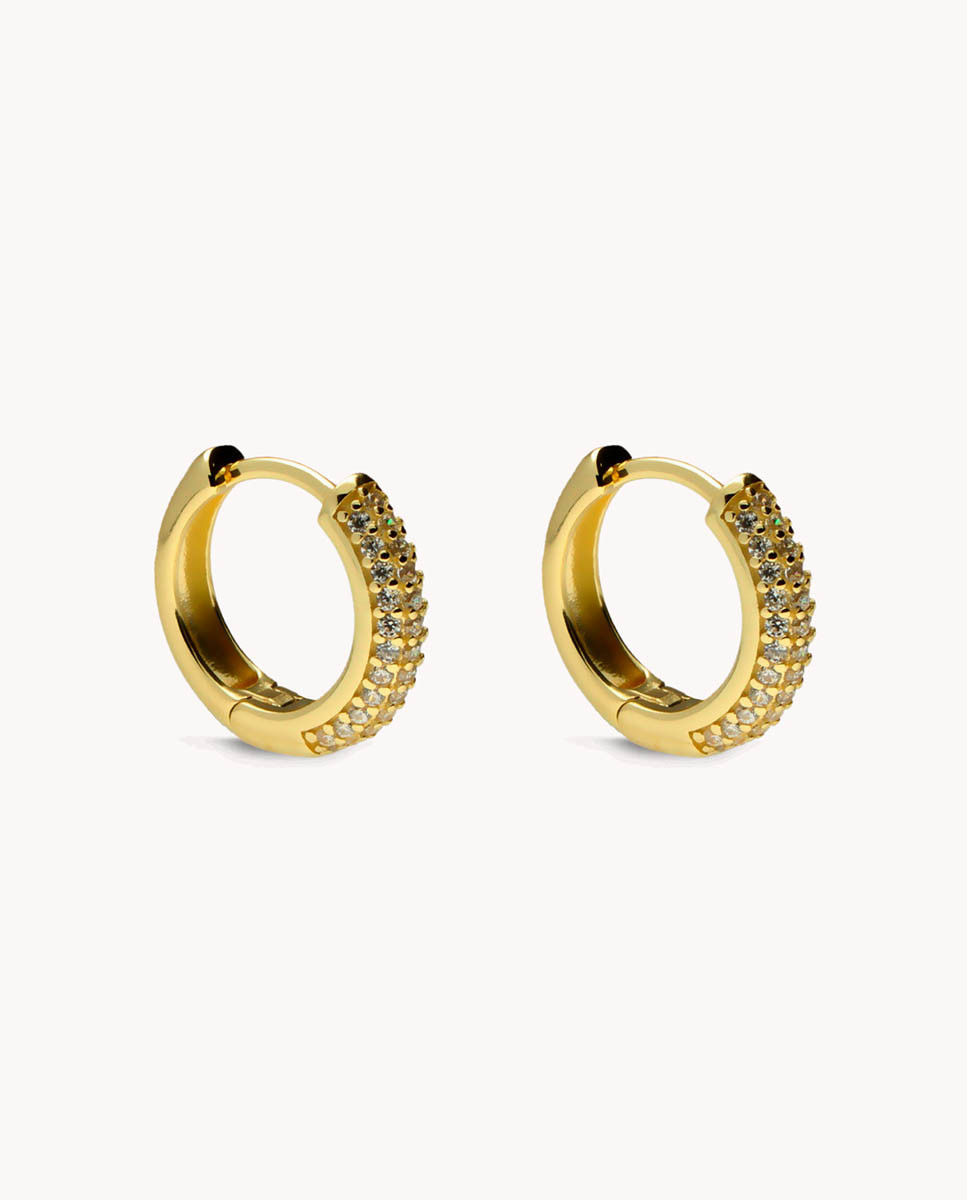 Pendientes de aro de plata de ley 925 bañada en oro 18K de 10 mm de diámetro interior y 3 mm de grosor con circonitas blancas en micro pavé en la parte delantera, cierre africano.