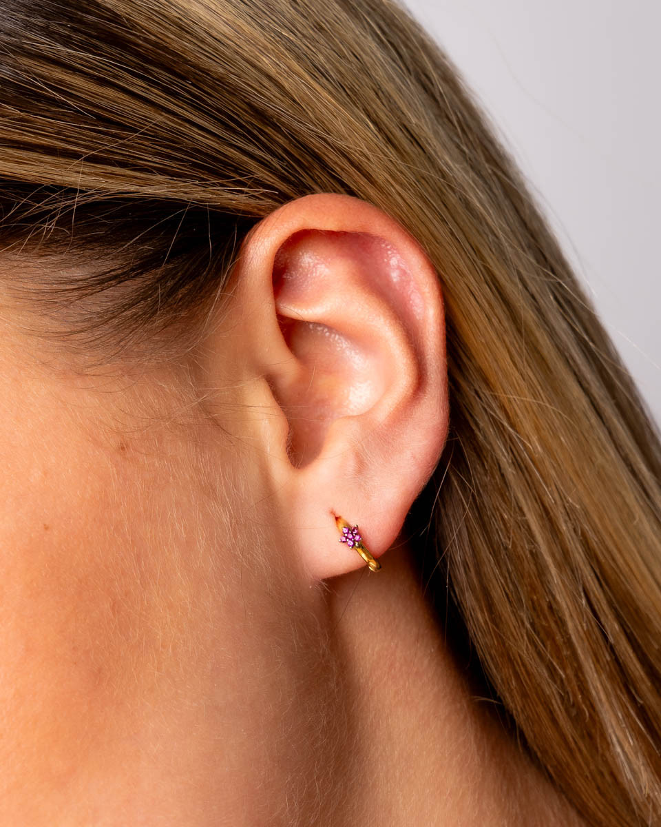 Pendientes de aro de plata de ley 925 bañada en oro 18K de 8 mm de diámetro interior y 2 mm de grosor con flor de 2 mm de circonitas rubí y cierre africano.