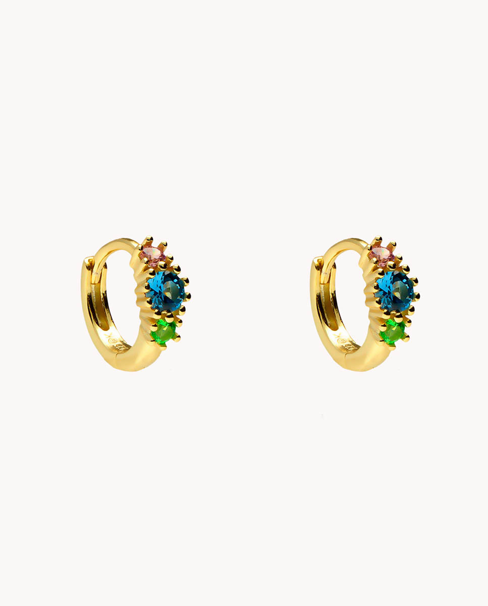 Pendientes de aro de plata de ley 925 bañada en oro 18K de 7,5 mm de diámetro interior y 2 mm de grosor con circonitas multicolor y cierre africano.