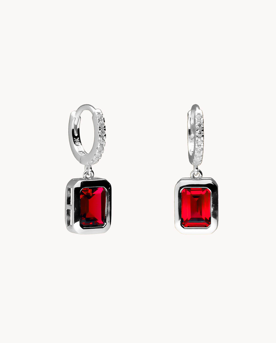 Pendientes de aro de plata de ley 925 bañada en rodio de 8 mm de diámetro interior y 2 mm de ancho con circonitas blancas, colgante en forma rectangular con circonita color granate de 6 mm x 8 mm (ancho por alto) y cierre africano.