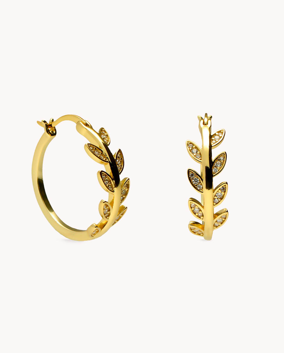 Pendientes de aro de plata de ley 925 bañada en oro 18K de 18 mm de diámetro interior y 2 mm de ancho, con circonitas blancas formando hojas de 3 mm de ancho y cierre catalán.
