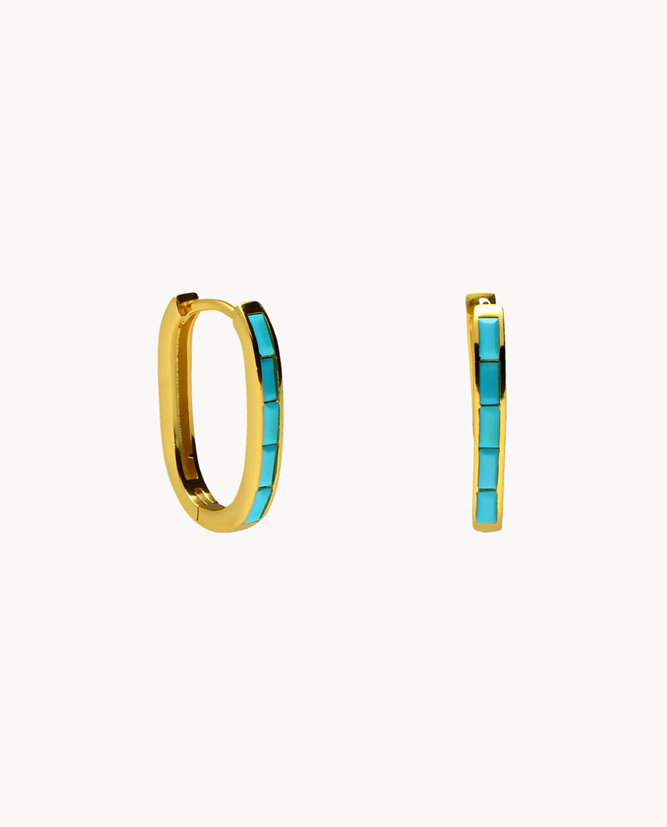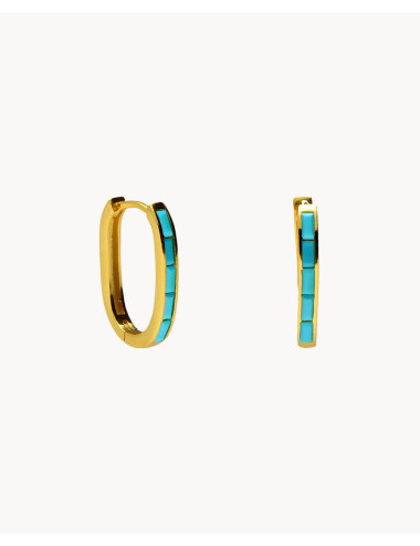 Pendientes de aro de plata de ley 925 bañada en oro 18K con forma ovalada de 9 mm x 15 mm (ancho por alto) y 2,5 mm de ancho con piedras color turquesa y cierre tipo africano.