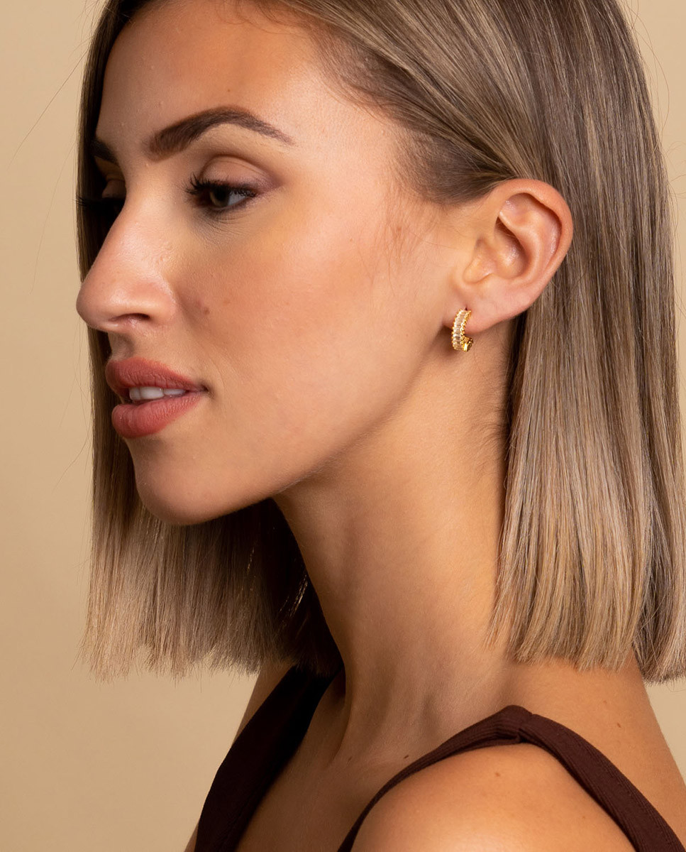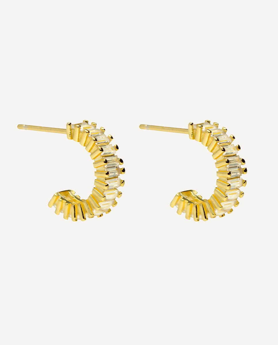 Pendientes de medio aro de plata de ley 925 bañada en oro de 9 mm de diámetro interior con circonitas blancas talla baguette, cierre de presión.