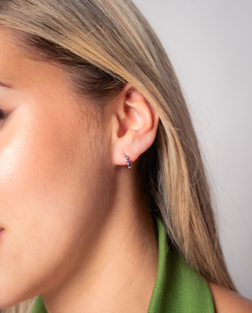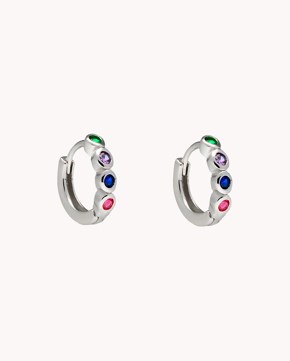 Pendientes de aro de plata de ley 925 bañada en rodio de 8 mm de diámetro interior y 2 mm de ancho con circonitas multicolor y cierre africano.