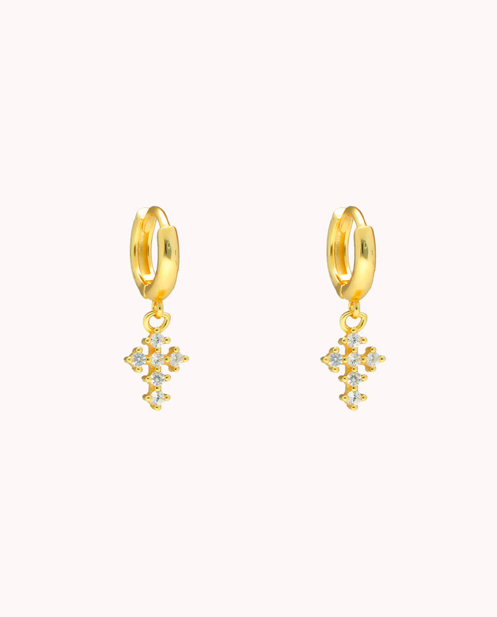 Pendientes de aro de plata de ley 925 bañada en oro de 7 mm de diámetro interior y 2 mm de ancho, colgante de cruz con circonitas blancas y cierre africano.