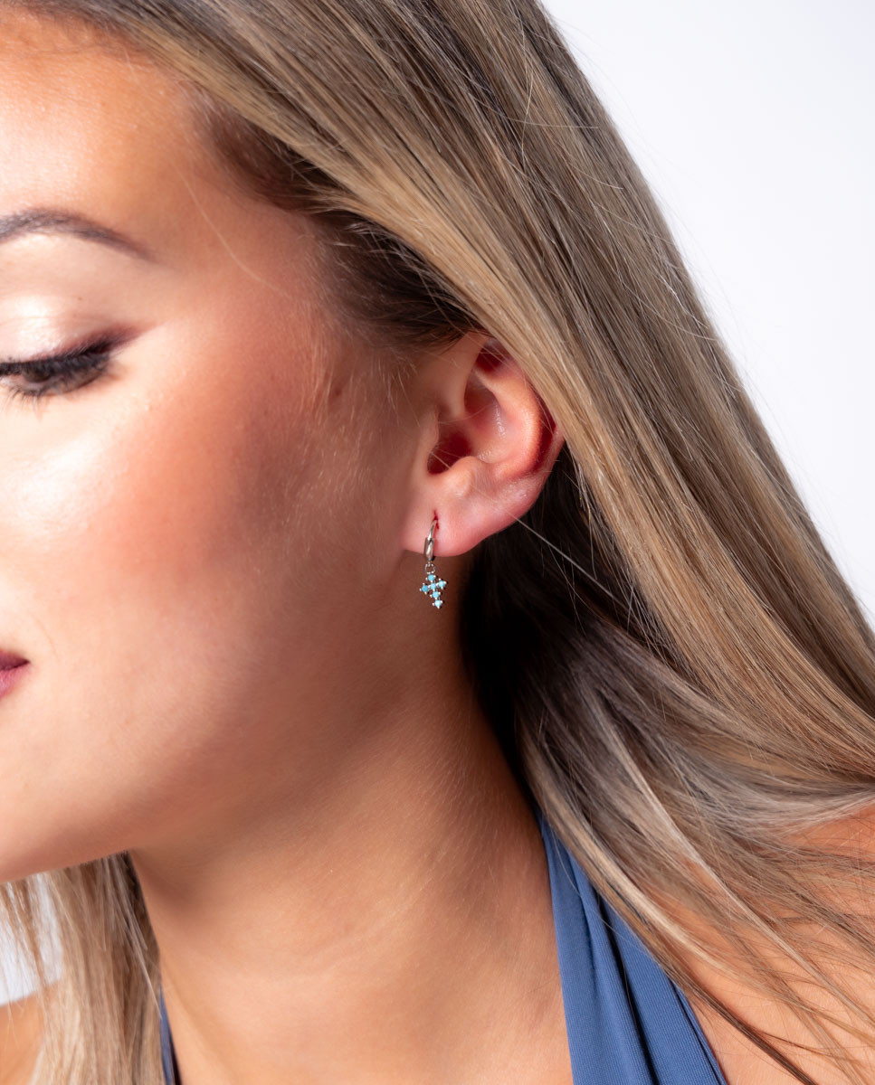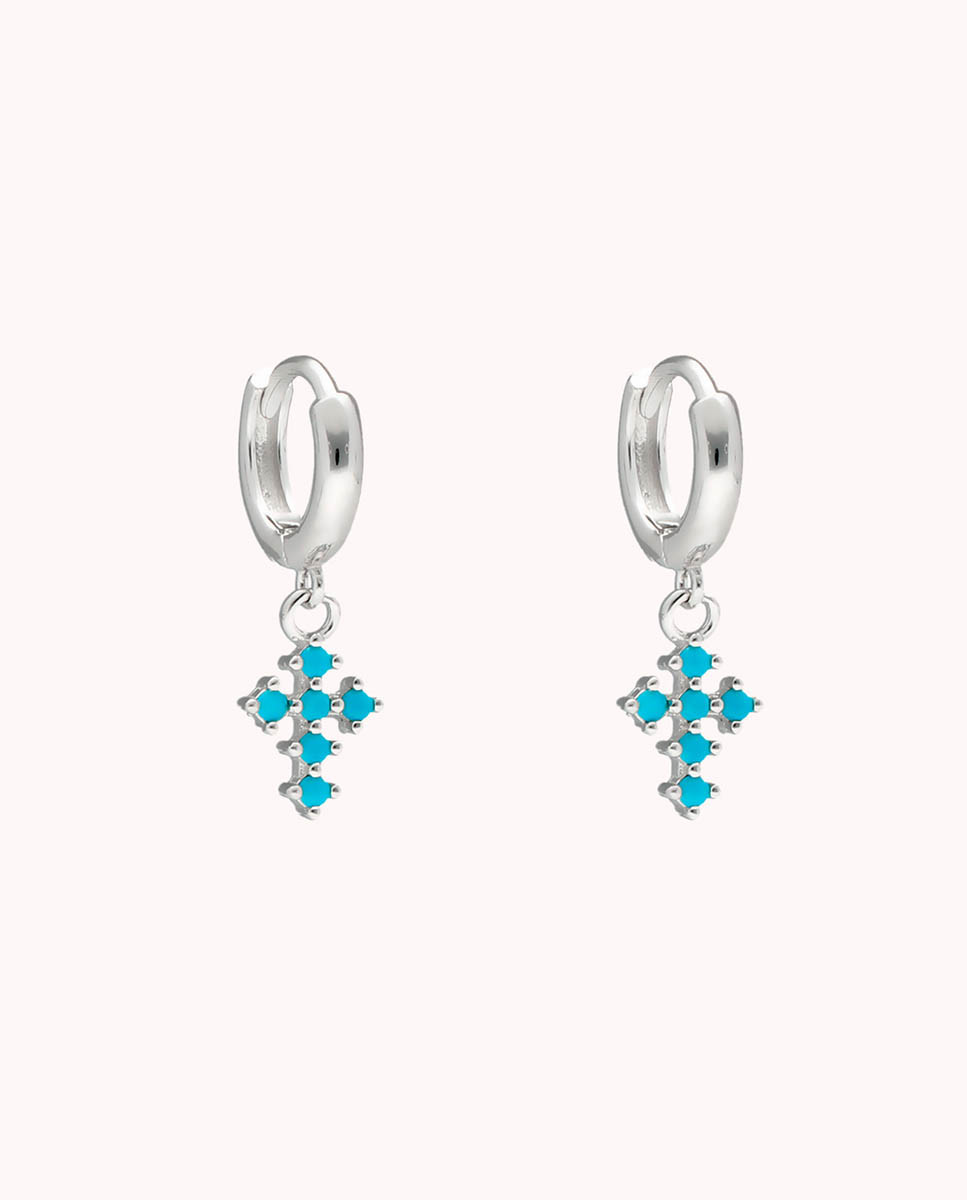 Pendientes de aro mini cruz de plata de ley 925 bañados en rodio con cruz y turquesas