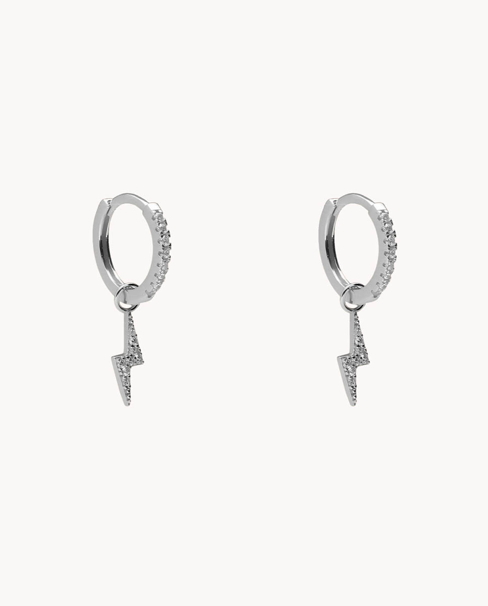Pendientes de aro de 10 mm de diámetro con colgante en forma de rayo con circonitas blancas de 11 mm de alto con movimiento libre y extraible, plata de ley 925 bañada en rodio y cierre africano.