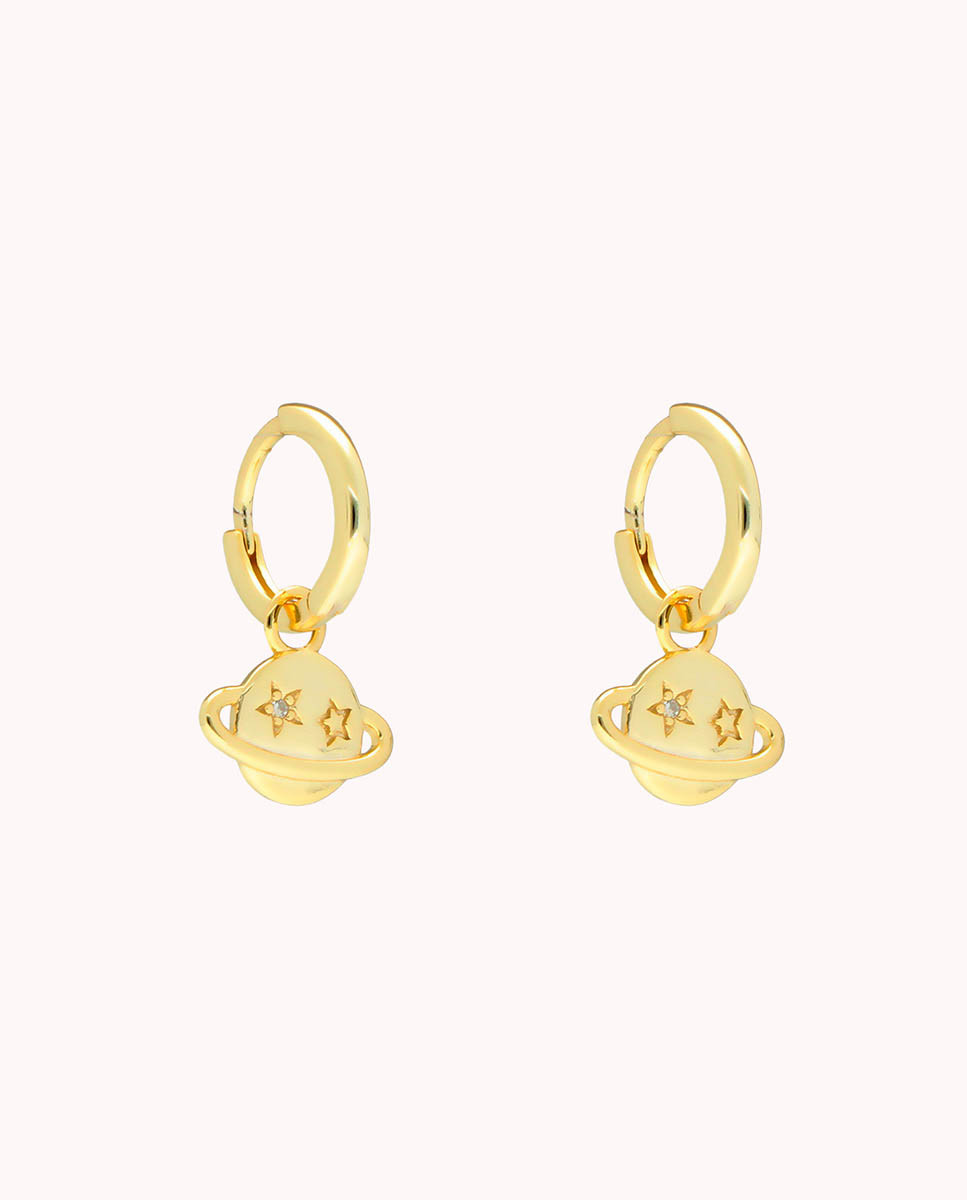 Pendientes de aro de plata de ley 925 bañados en oro de 9 mm de diámetro interior con colgante en forma de planeta de 12 mm x 7 mm (ancho por alto) con movimiento libre y cierre africano.