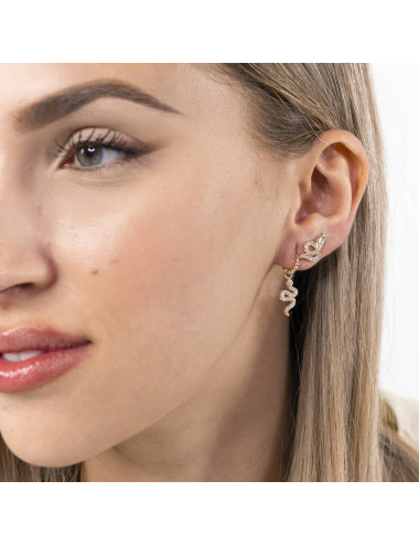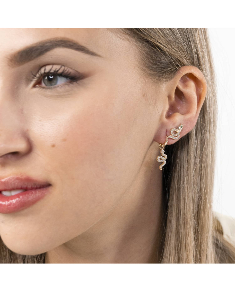 Pendientes de aro de plata de ley 925 bañada en oro de 7 mm de diámetro (interior) y 1,5 mm de ancho, detalle de bolitas y colgante de serpiente de 8 mm x 15 mm (ancho por alto) con circonitas blancas, cierre africano.