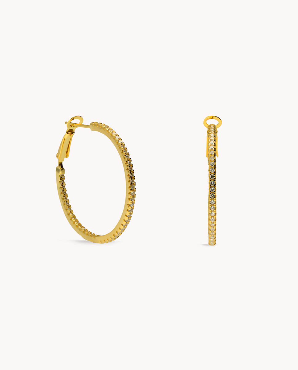 Pendientes de aro de plata de ley 925 bañada en oro 18k con circonitas blancas, 26 mm de diámetro interior y 2 mm de ancho, cierre catalán.