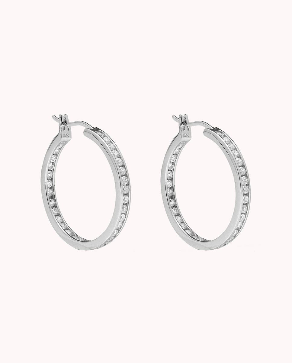 Pendientes de aro de plata de ley 925 bañada en rodio de 25 mm de diámetro interior y 3,5 mm de ancho, circonitas blancas y cierre catalán.