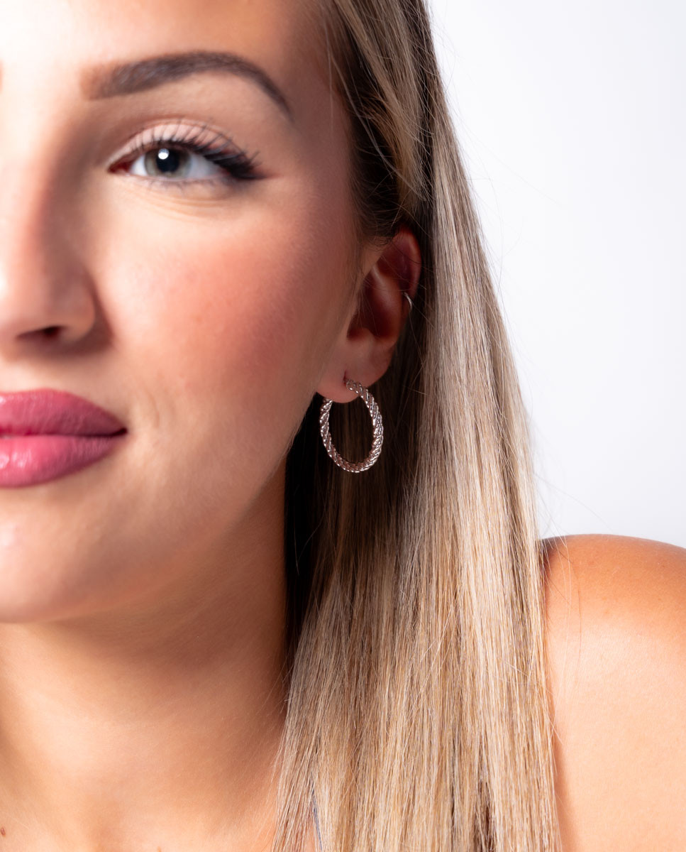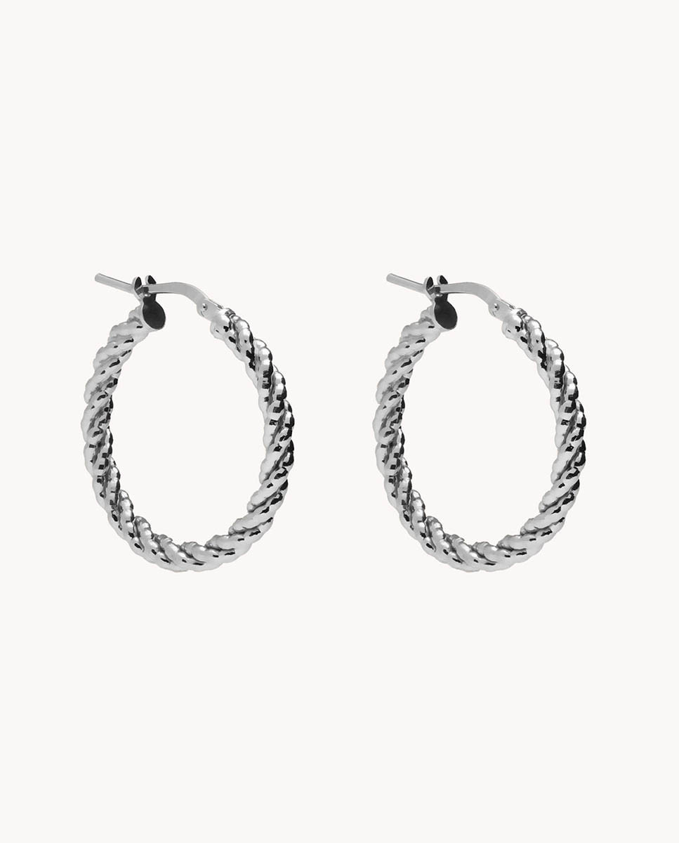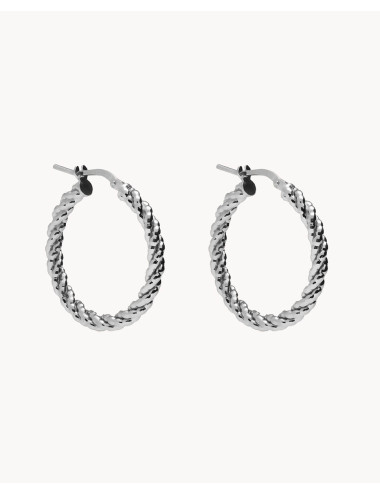 Pendientes de aro de plata de ley 925 bañada en rodio con diseño trenzado de 20 mm de diámetro interior y 3 mm de ancho, cierre catalán.