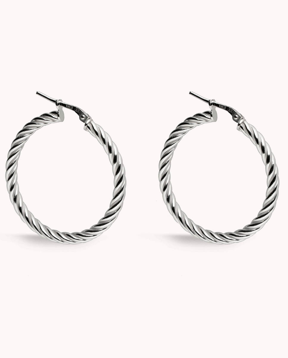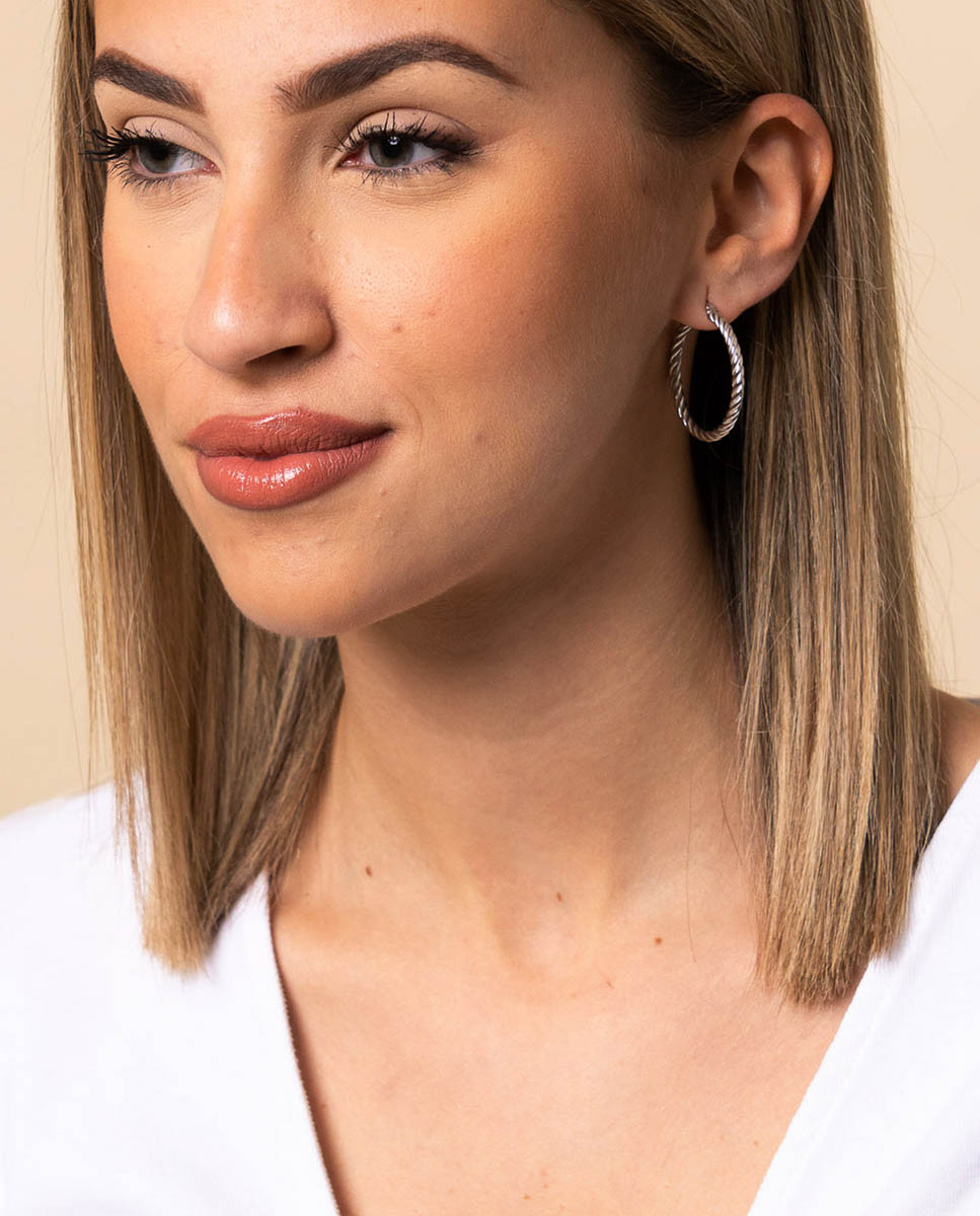 Pendientes de aro de plata de ley 925 bañada en rodio con diseño trenzado de 25 mm de diámetro interior y 3 mm de ancho, cierre catalán.
