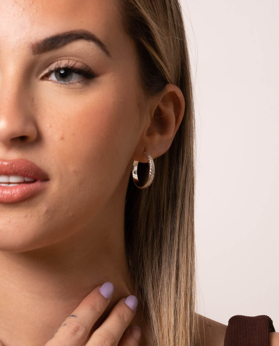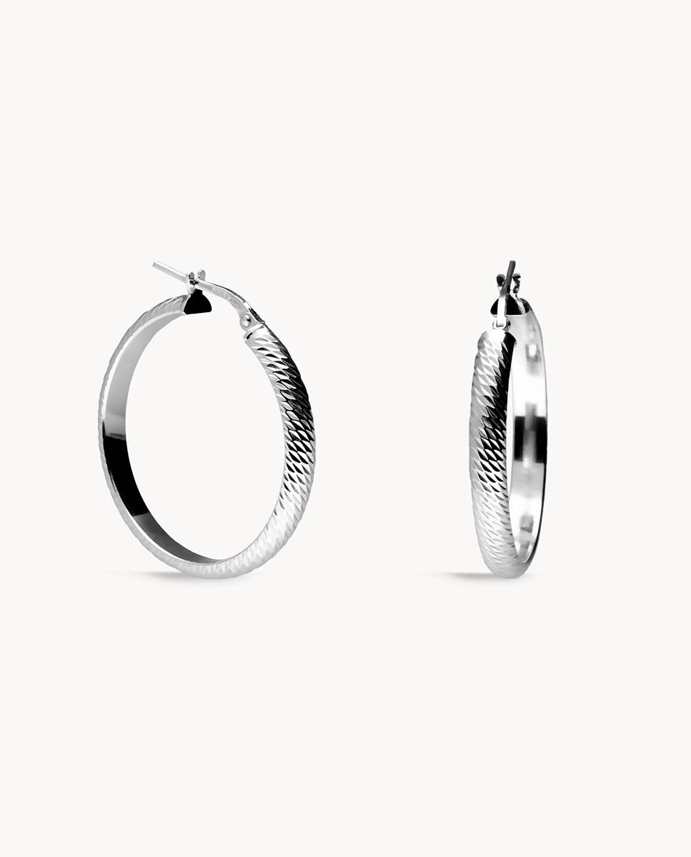 Pendientes de aro de plata de ley 925 bañada en rodio de 20 mm de diámetro interior y 4 mm de grosor, con diseño lapidado y cierre catalán.