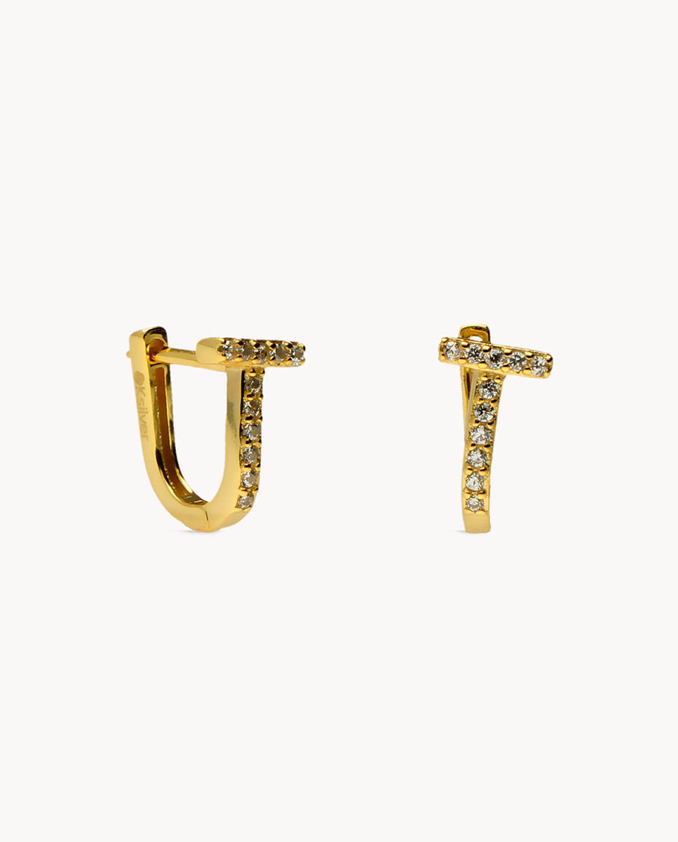 Pendientes de aro de plata de ley 925 bañada en oro de 5,5 mm de diámetro interior y 1,5 mm de ancho, con forma de T y circonitas blancas, cierre africano.
