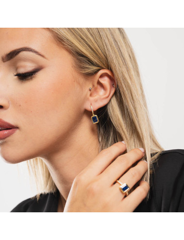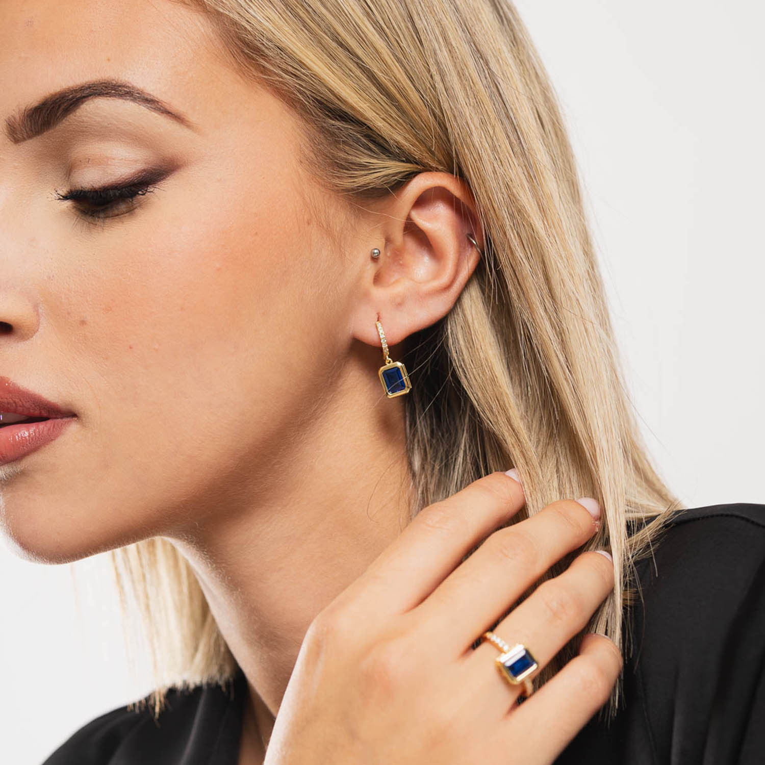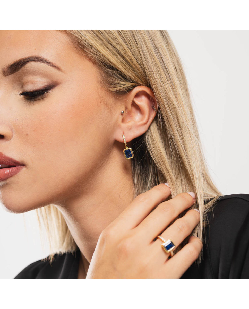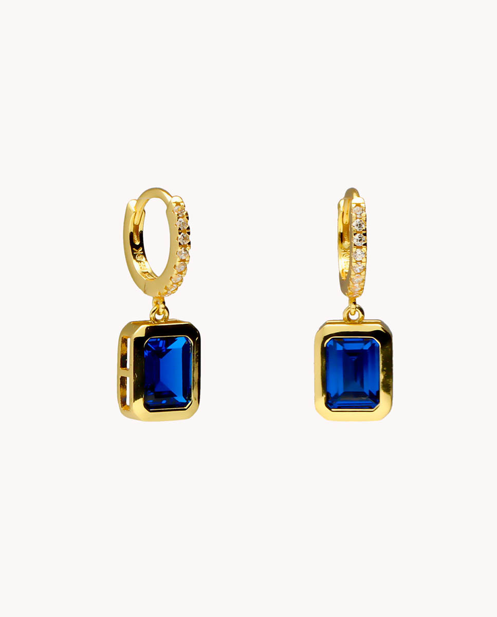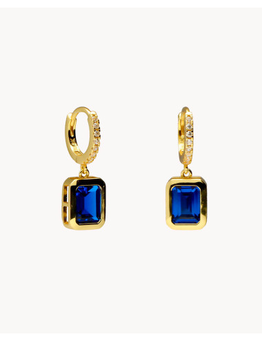 Pendientes de aro de plata de ley 925 bañada en oro 18K de 8 mm de diámetro interior y 2 mm de ancho con circonitas blancas, colgante en forma rectangular con circonita color zafiro de 6 mm x 8 mm (ancho por alto) y cierre africano.