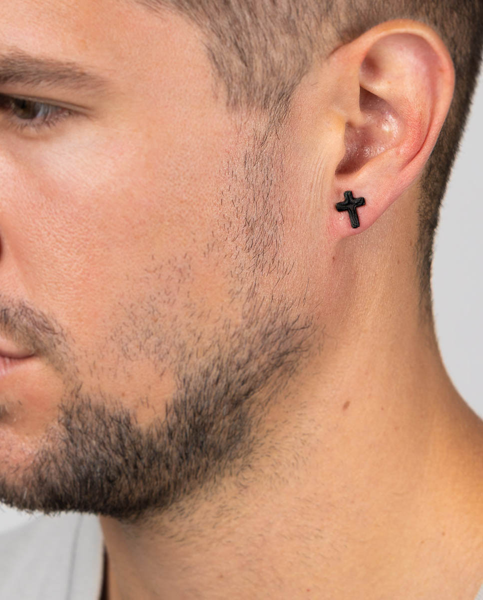 Pendientes de acero inoxidable bañados en IP negro con forma de cruz de 8 mm x 11 mm (ancho por alto) y cierre de presión.