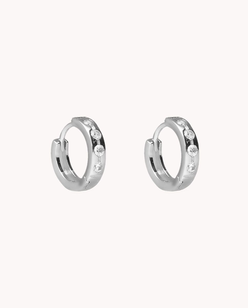 Pendientes de aro de plata de ley 925 bañada en rodio de 10 mm de diámetro (interior) y 4 mm de ancho, circonitas blancas en la parte delantera y cierre africano.