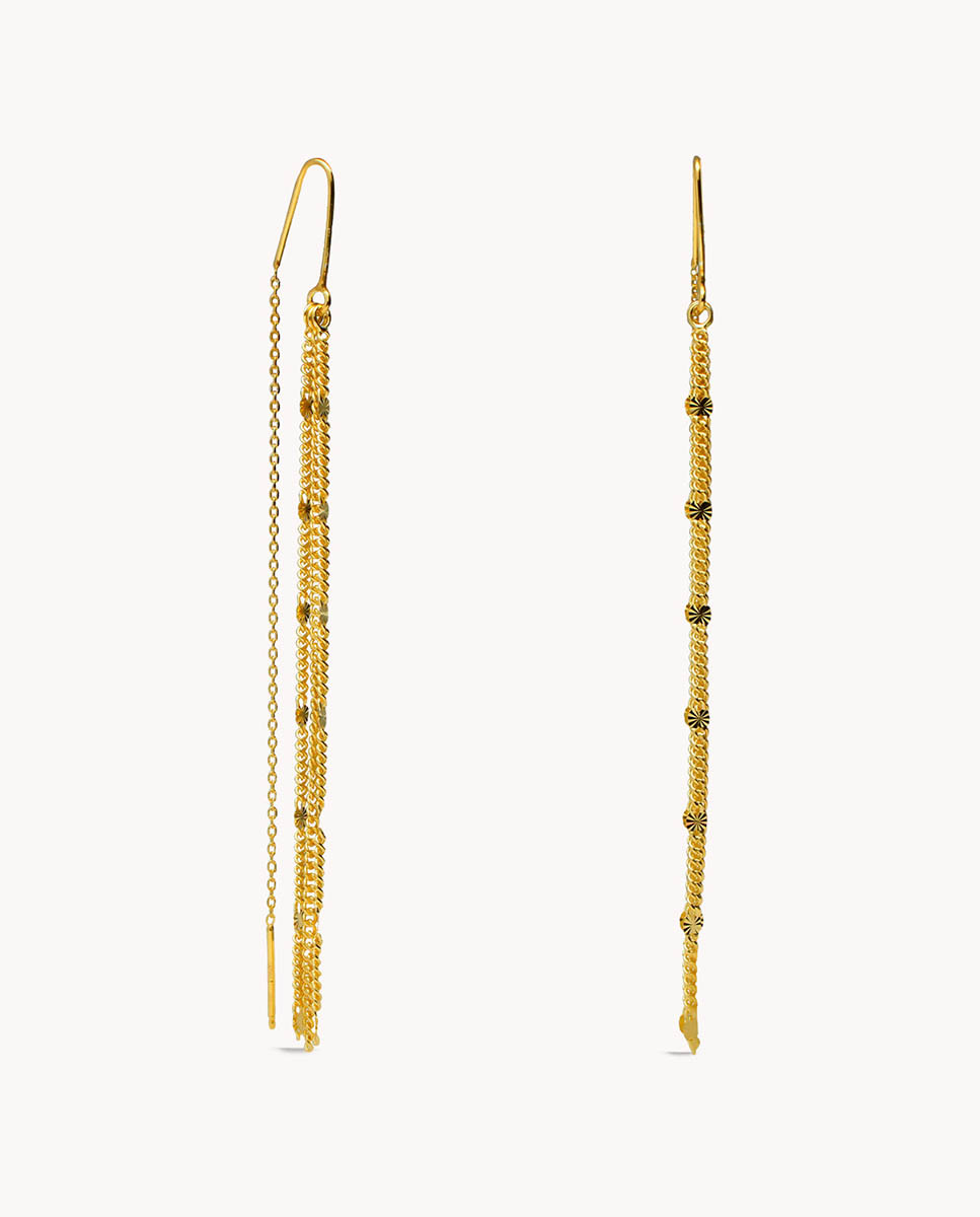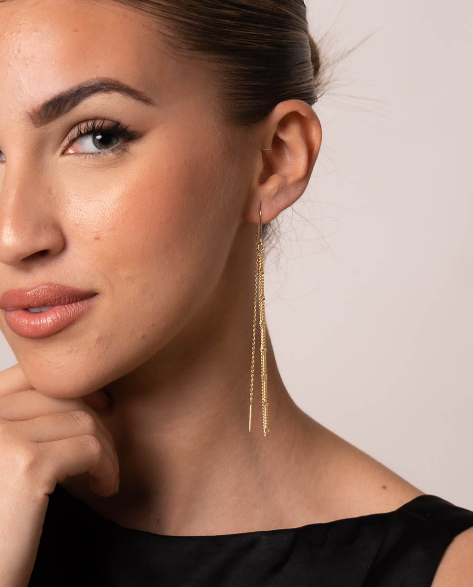 Pendientes de plata de ley 925 bañada en oro 18k con tres cadenas de 8,5 cms de largo aproximadamente y cierre de gancho con cadena de 9 cms de largo.