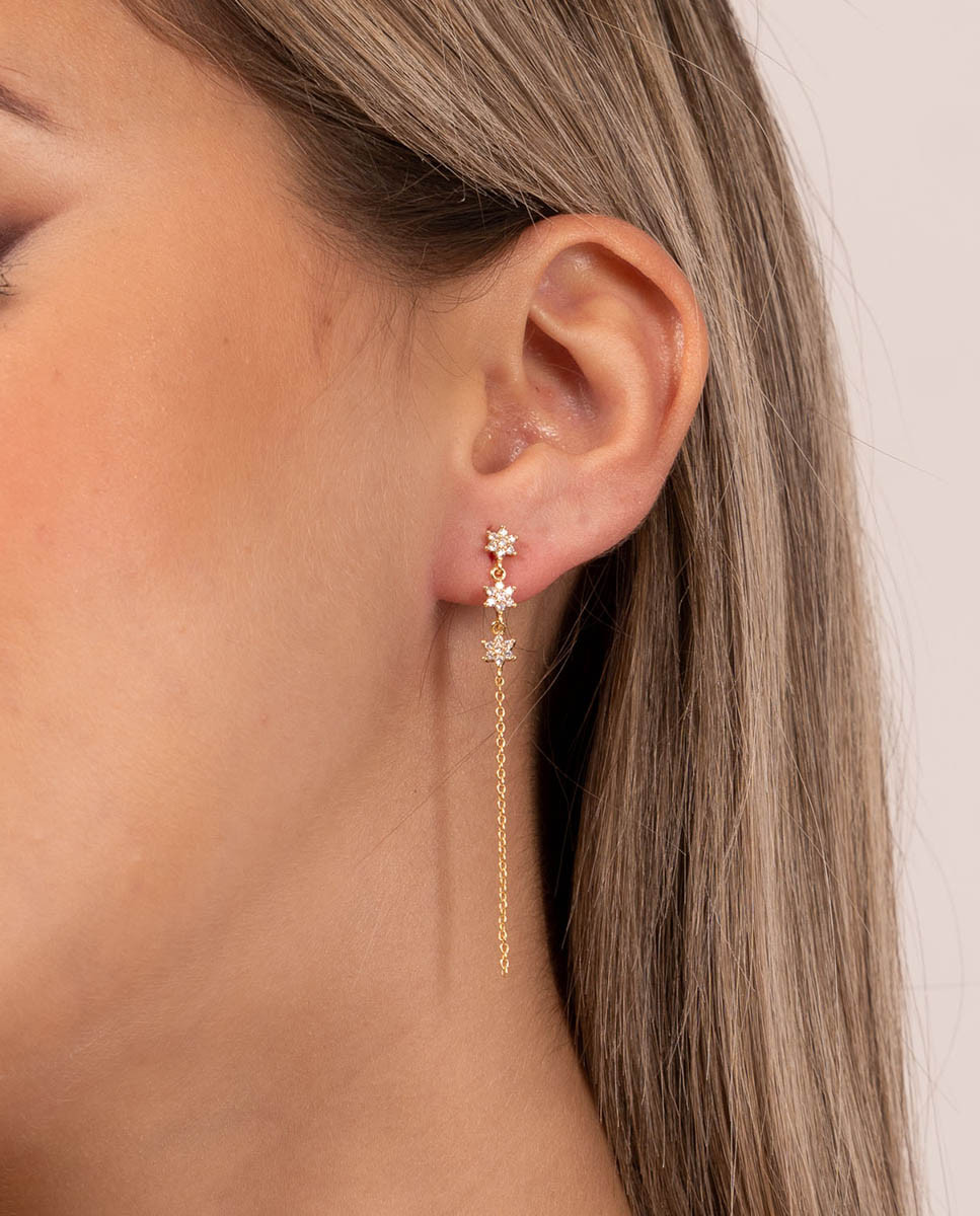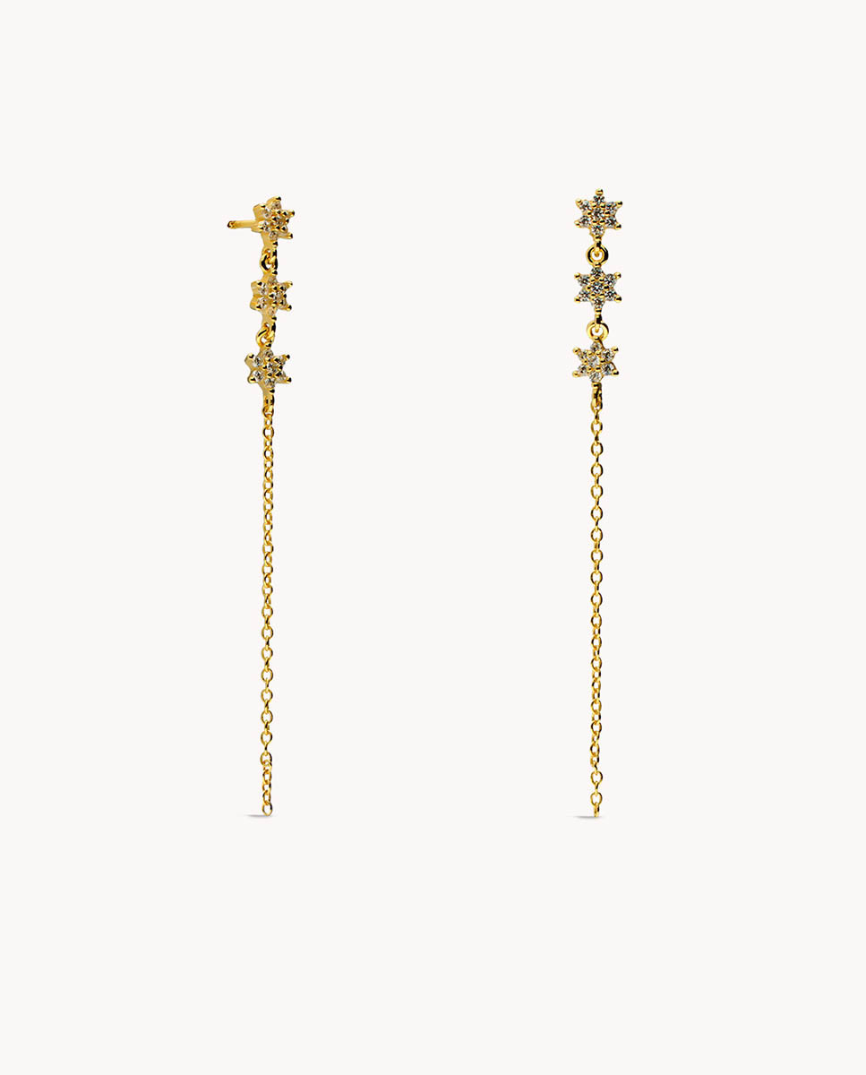 Pendientes de plata de ley 925 bañada en oro 18K de 6 cms de largo con tres estrellas de circonitas blancas y cadena, cierre de presión.