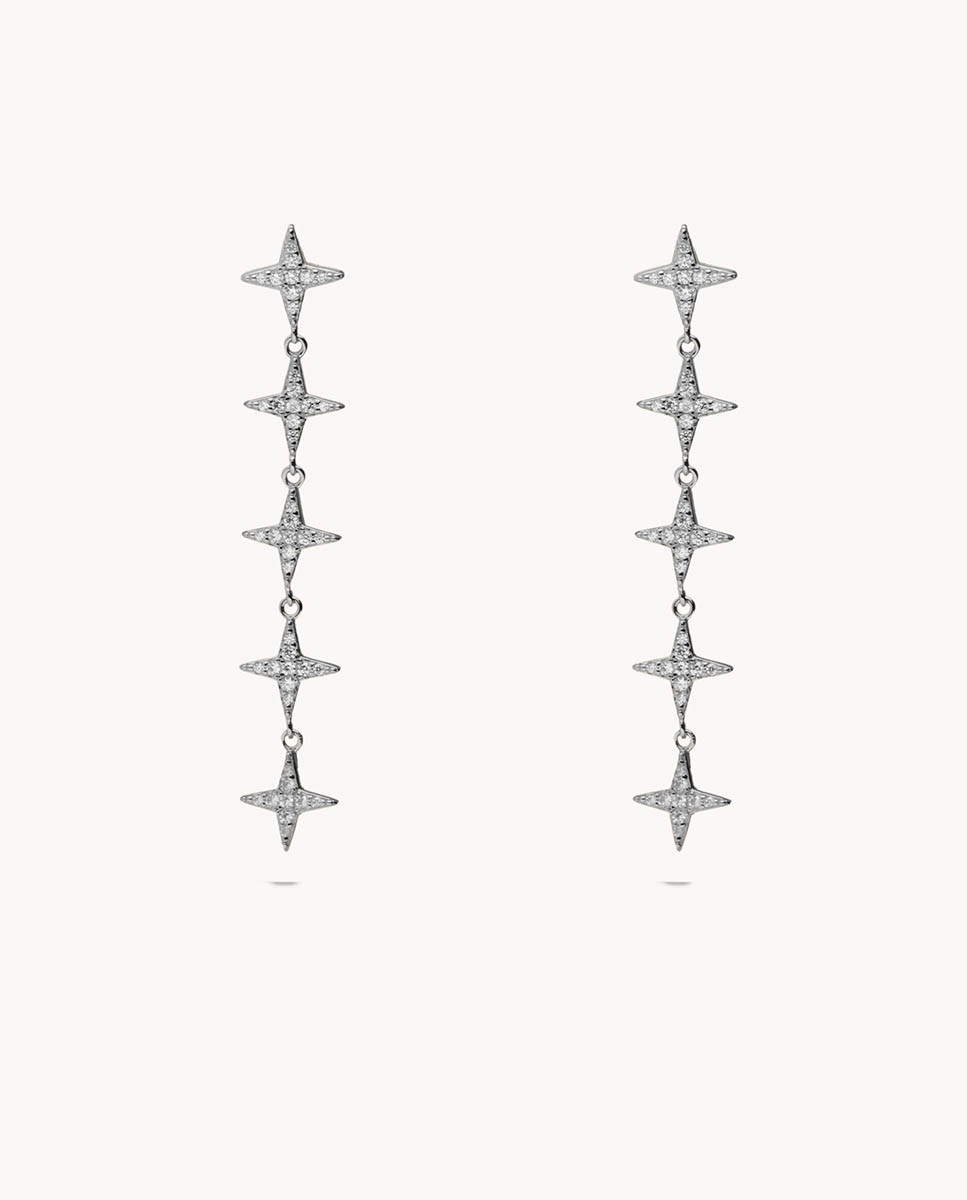 Pendientes de plata de ley 925 bañada en rodio de 5,5 cms de largo, con cinco estrellas de circonitas blancas de 9 mm x 9 mm (ancho por alto) cada una y cierre de presión.