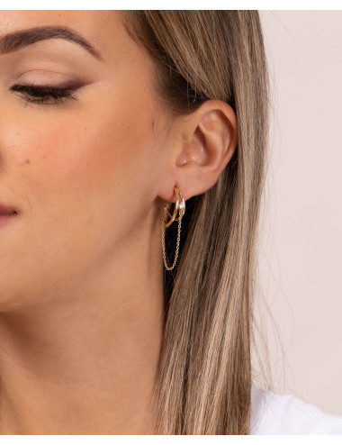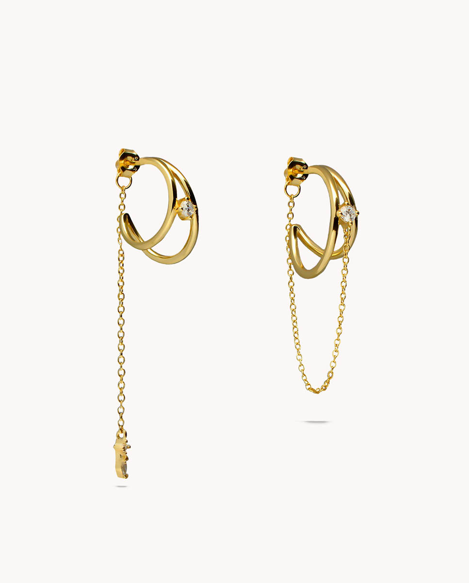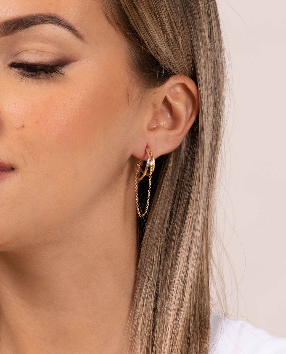 Pendientes de plata de ley 925 bañada en oro 18K, doble aro con circonita central blanca de 3 mm de diámetro y cierre de presión con cadena de 7 cms de largo hacia el cierre y cadena de 5 cms de largo con circonita blanca en el extremo.