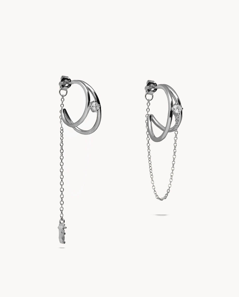 Pendientes de plata de ley 925 bañada en rodio, doble aro con circonita central blanca de 3 mm de diámetro y cierre de presión con cadena de 7 cms de largo hacia el cierre y cadena de 5 cms de largo con circonita blanca en el extremo.