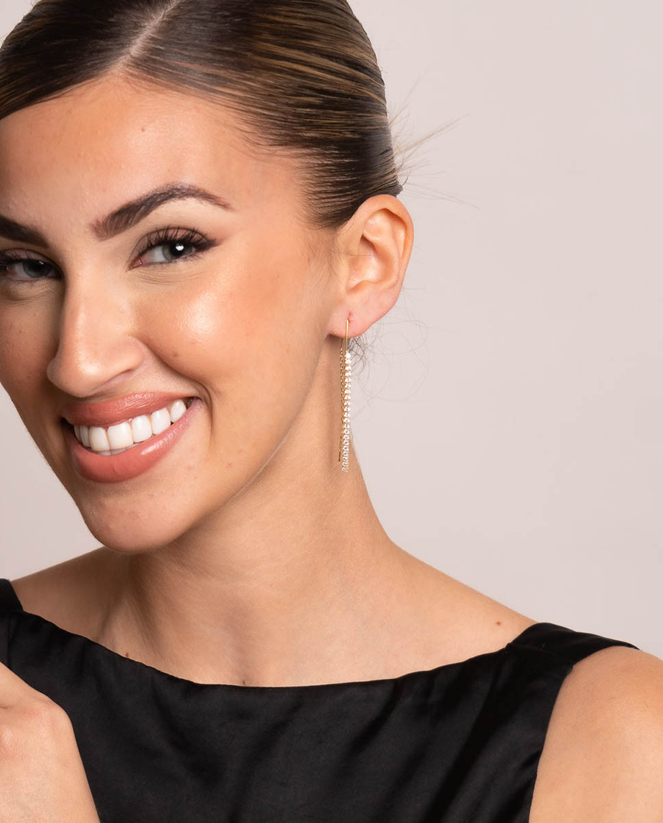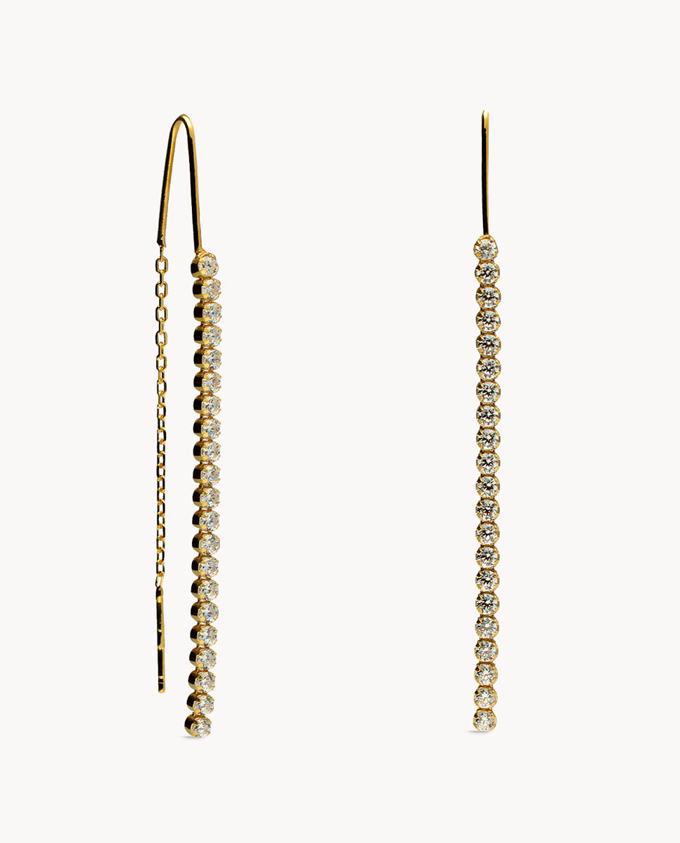 Pendientes de plata de ley 925 bañada en oro 18k con una tira de circonitas blancas de 5 cms de largo y cierre de gancho con cadena de 4,5 cms de largo.