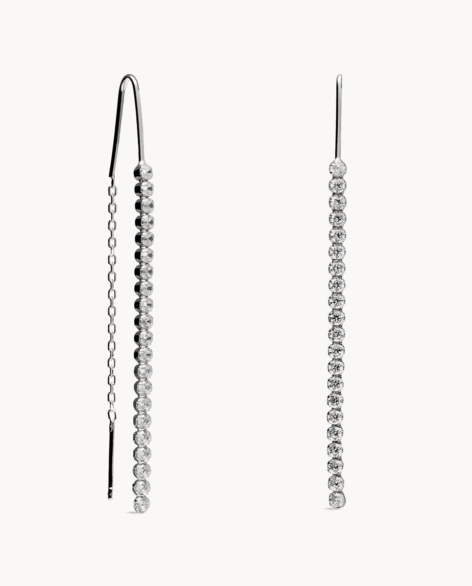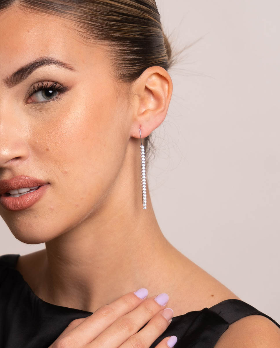 Pendientes de plata de ley 925 bañada en rodio con una tira de circonitas blancas de 5 cms de largo y cierre de gancho con cadena de 4,5 cms de largo.