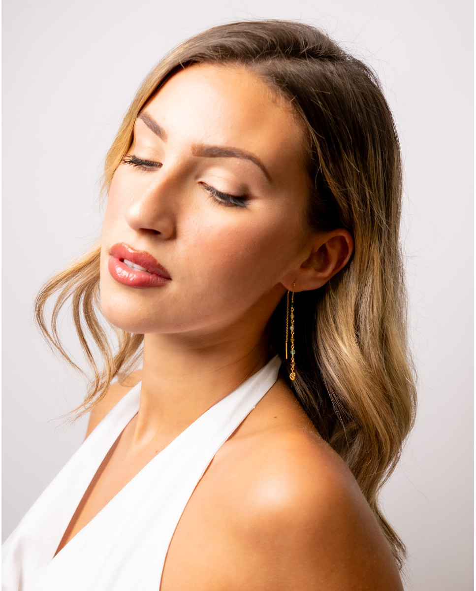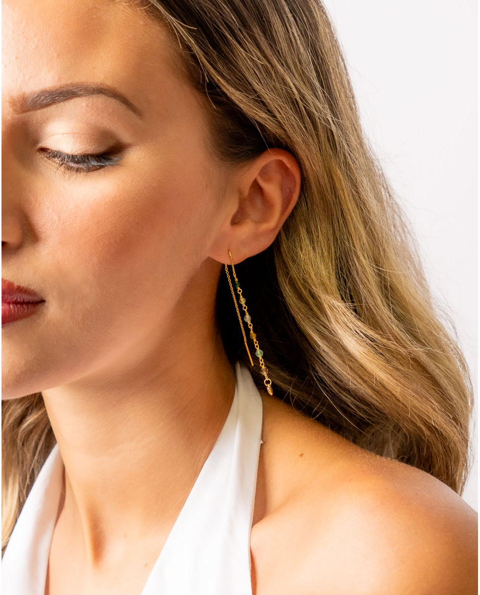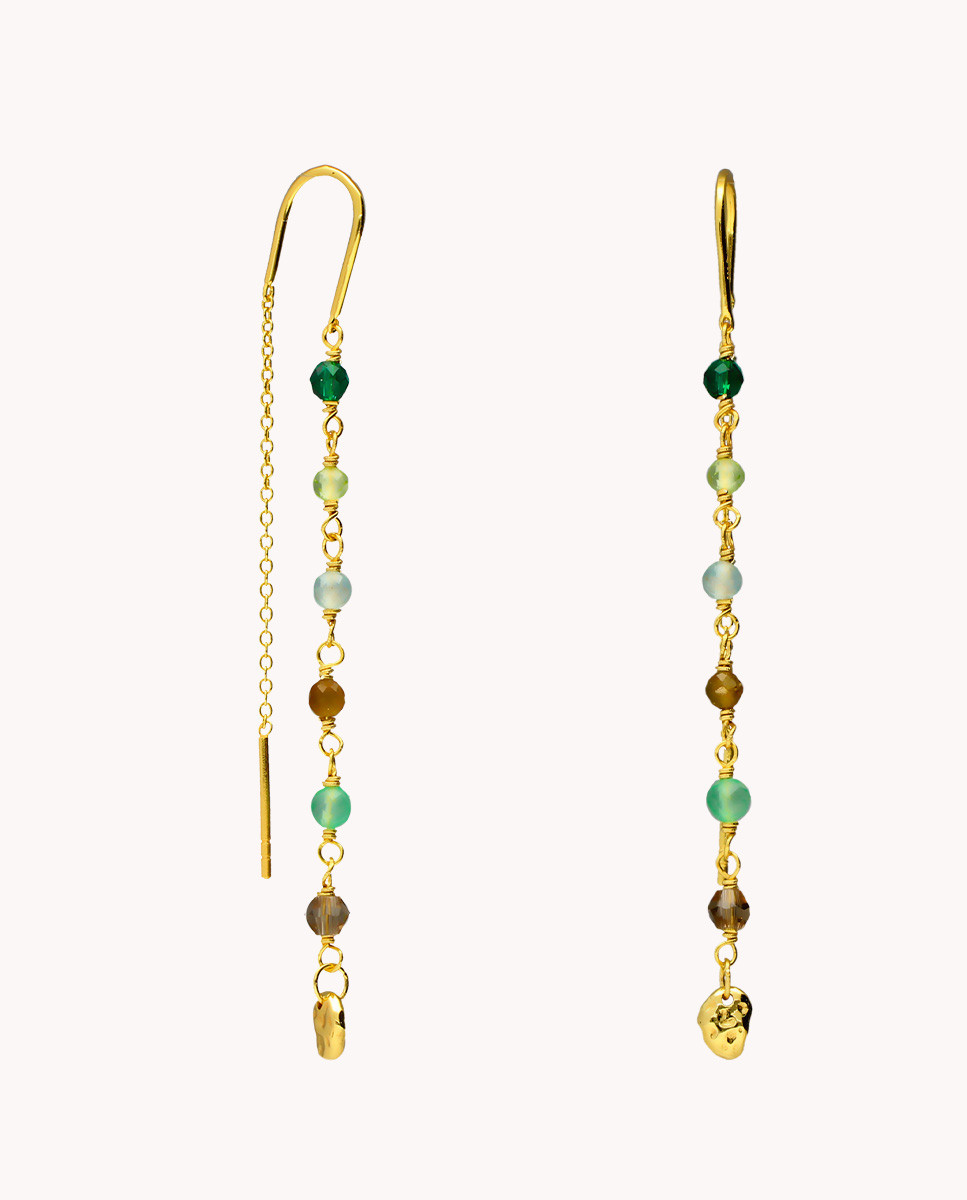 Pendientes largos de plata de ley 925 bañada en oro 18K con una cadena con combinación en diferentes tonos de piedras verdes de 5 cms de largo aproximadamente y cierre de gancho con cadena de 4 cms.