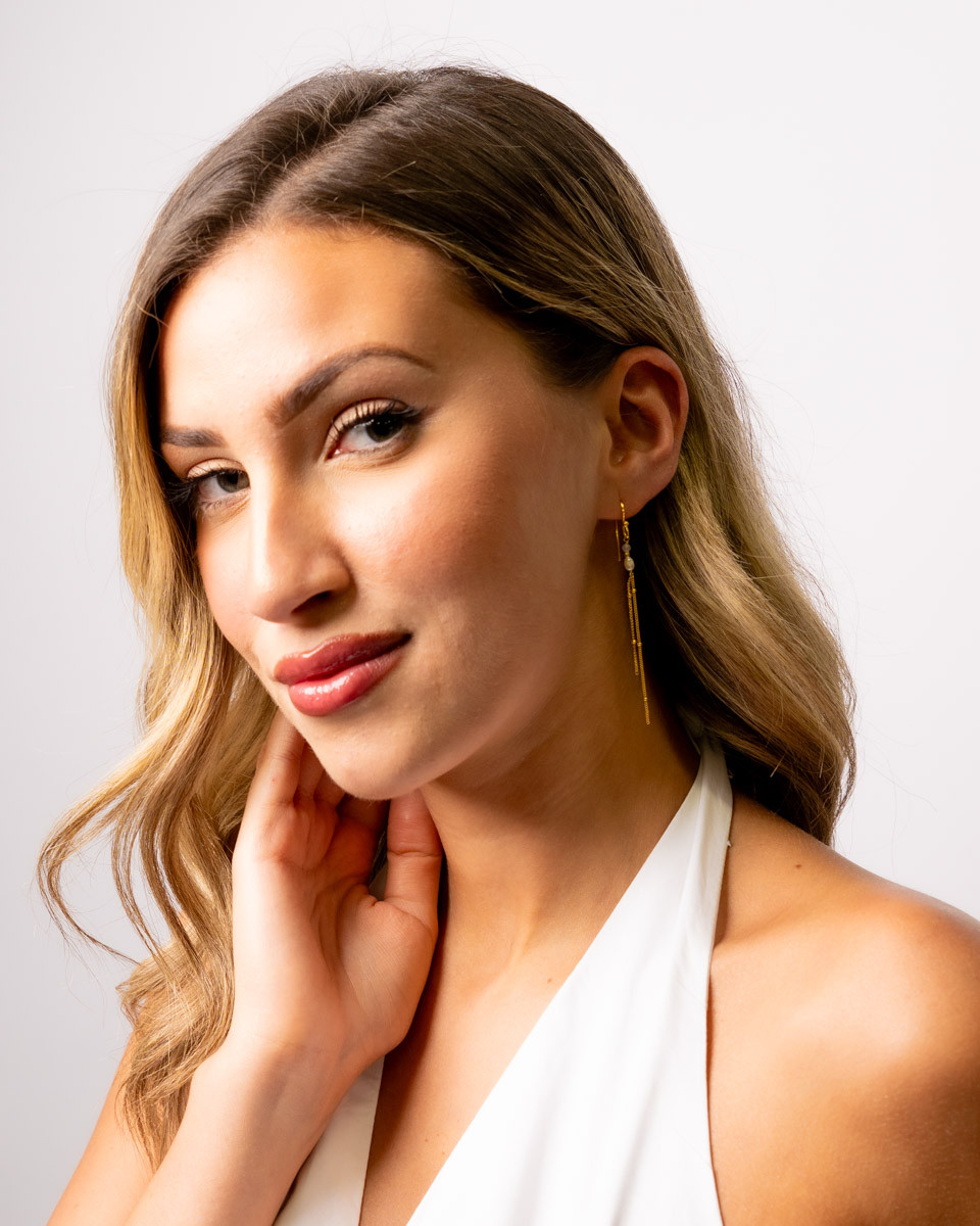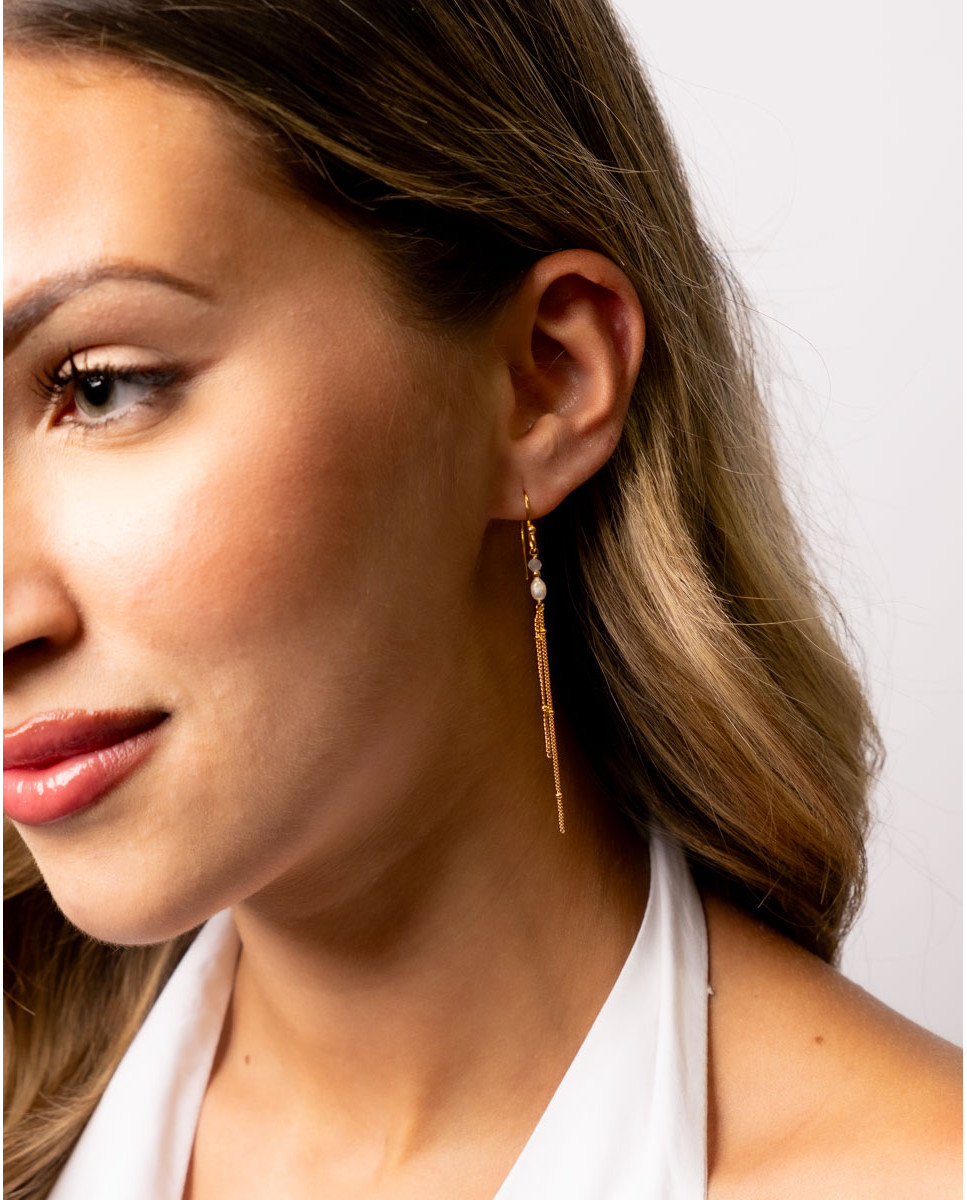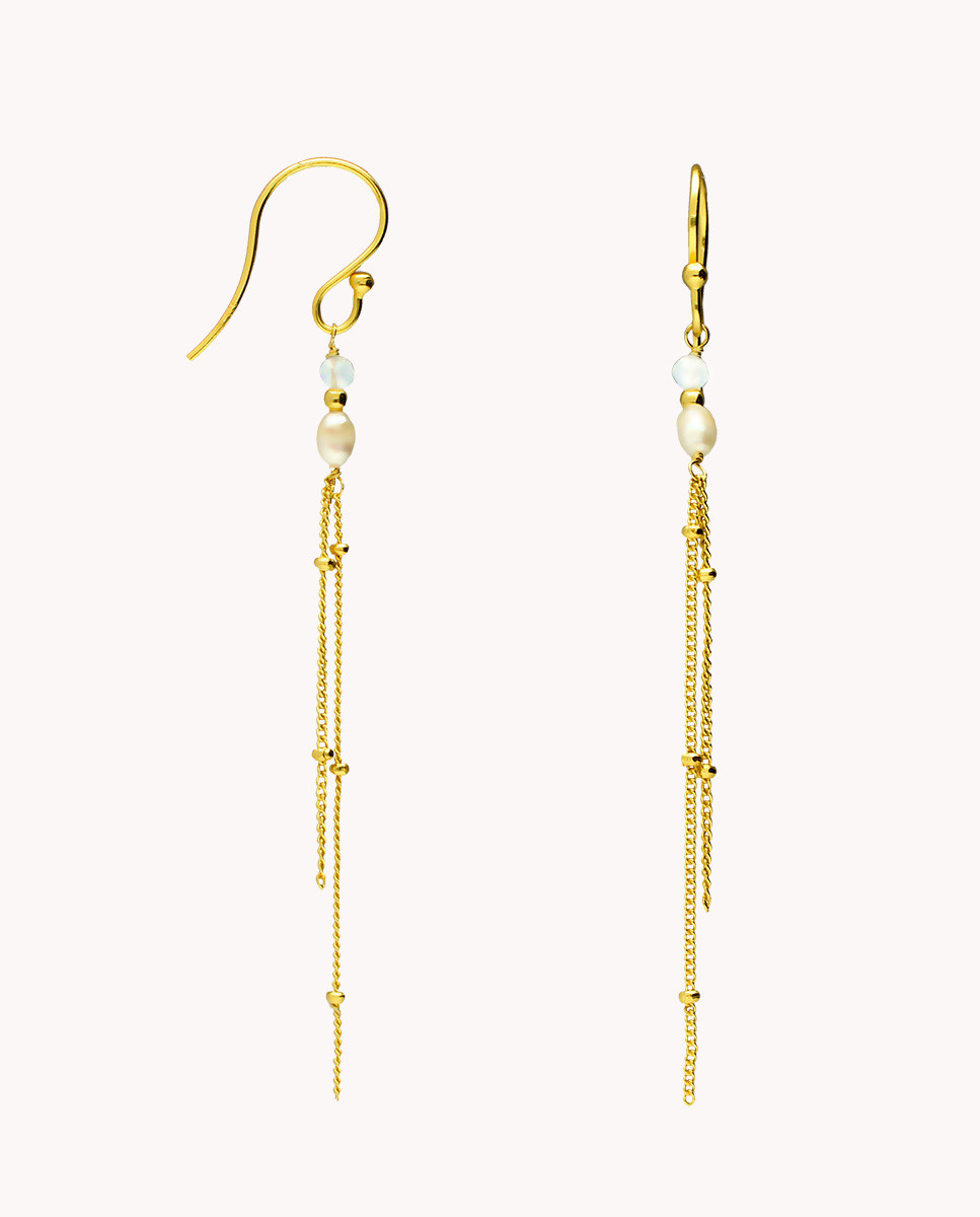 Pendientes de plata de ley 925 bañada en oro 18K con piedra turquesa, perla cultivada y dos cadenas, largo total de 6 cms y cierre de gancho
