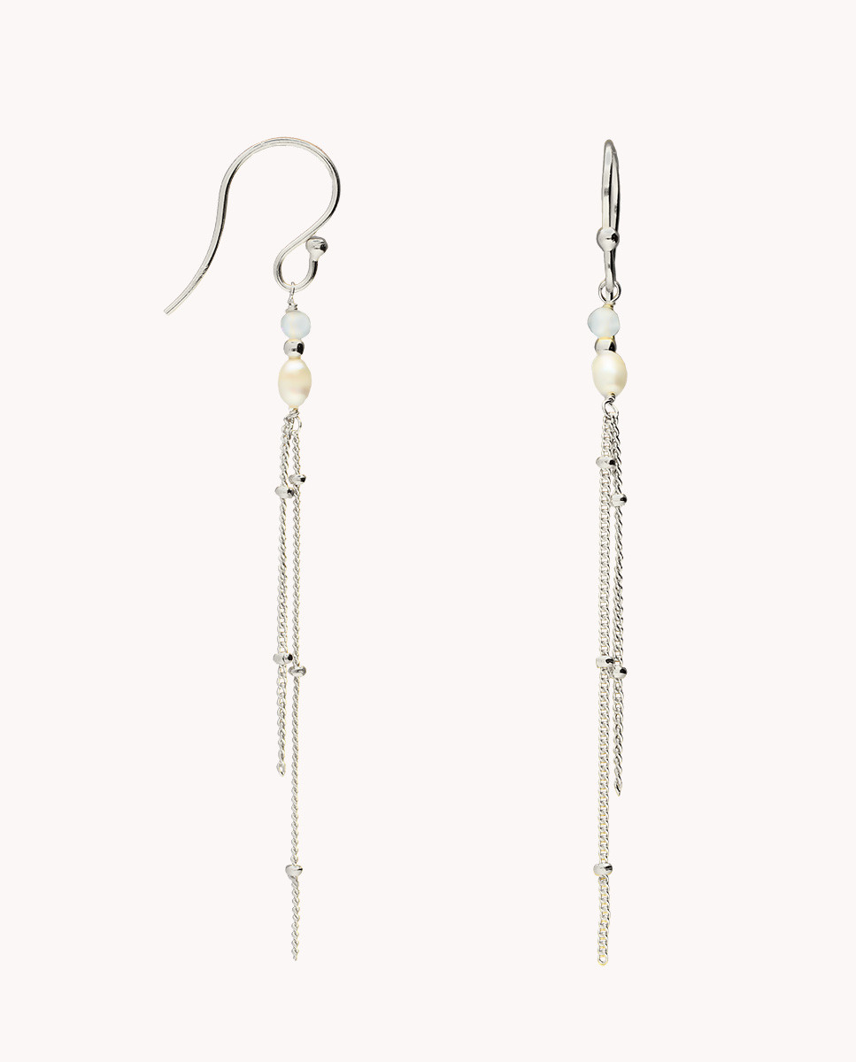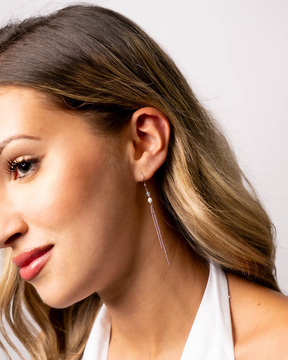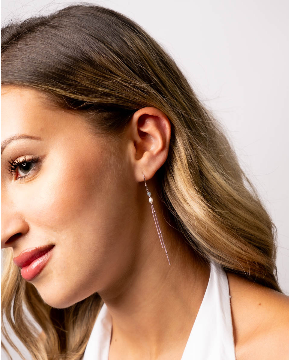 Pendientes largos de plata de ley 925 bañada en rodio con piedra turquesa, perla cultivada y dos cadenas, largo total de 6 cms y cierre de gancho