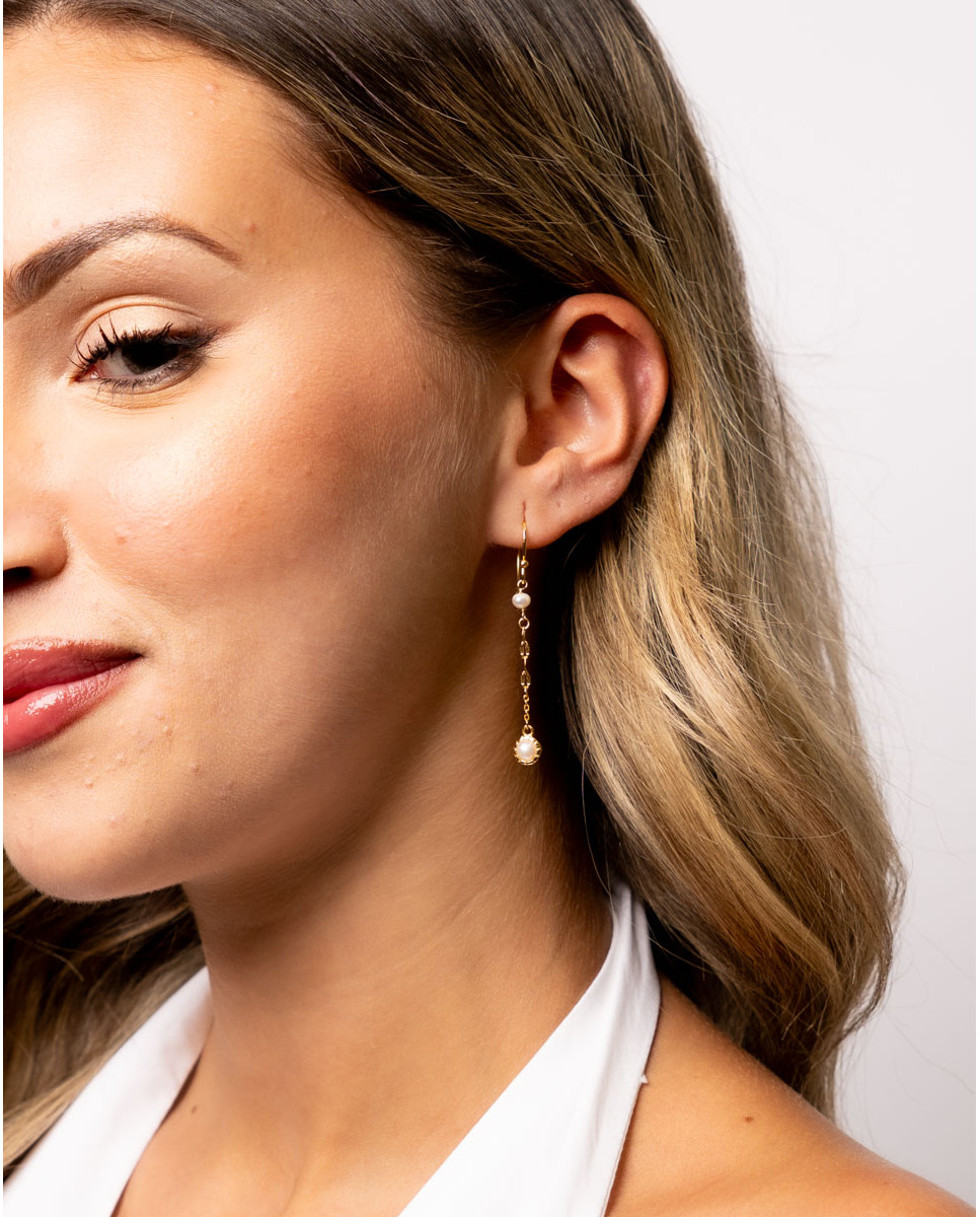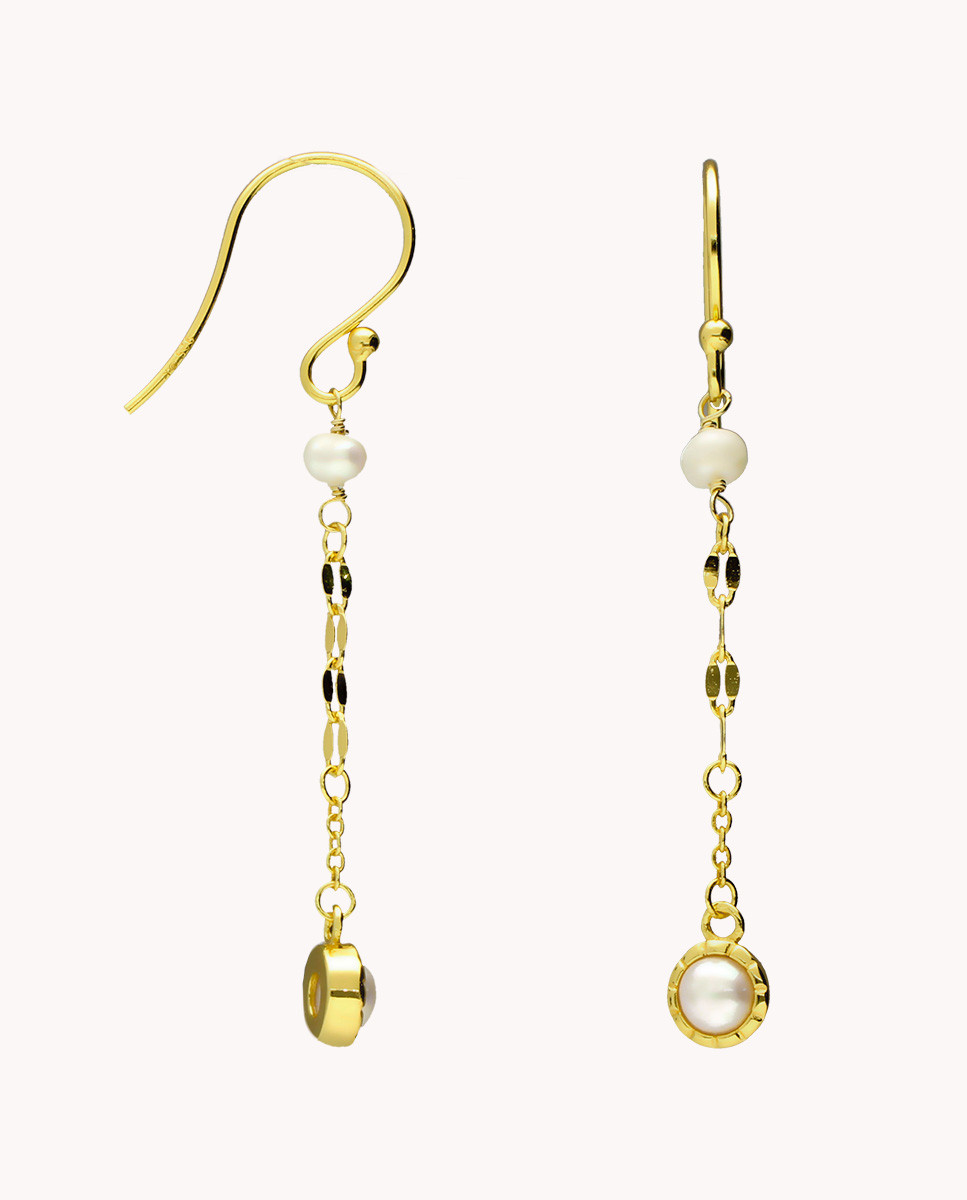 Pendientes largos de plata de ley 925 bañada en oro 18k con perla cultivada de 3mm, cadena de 3,5 cms y al final perla engastada de 3 mm, cierre de gancho