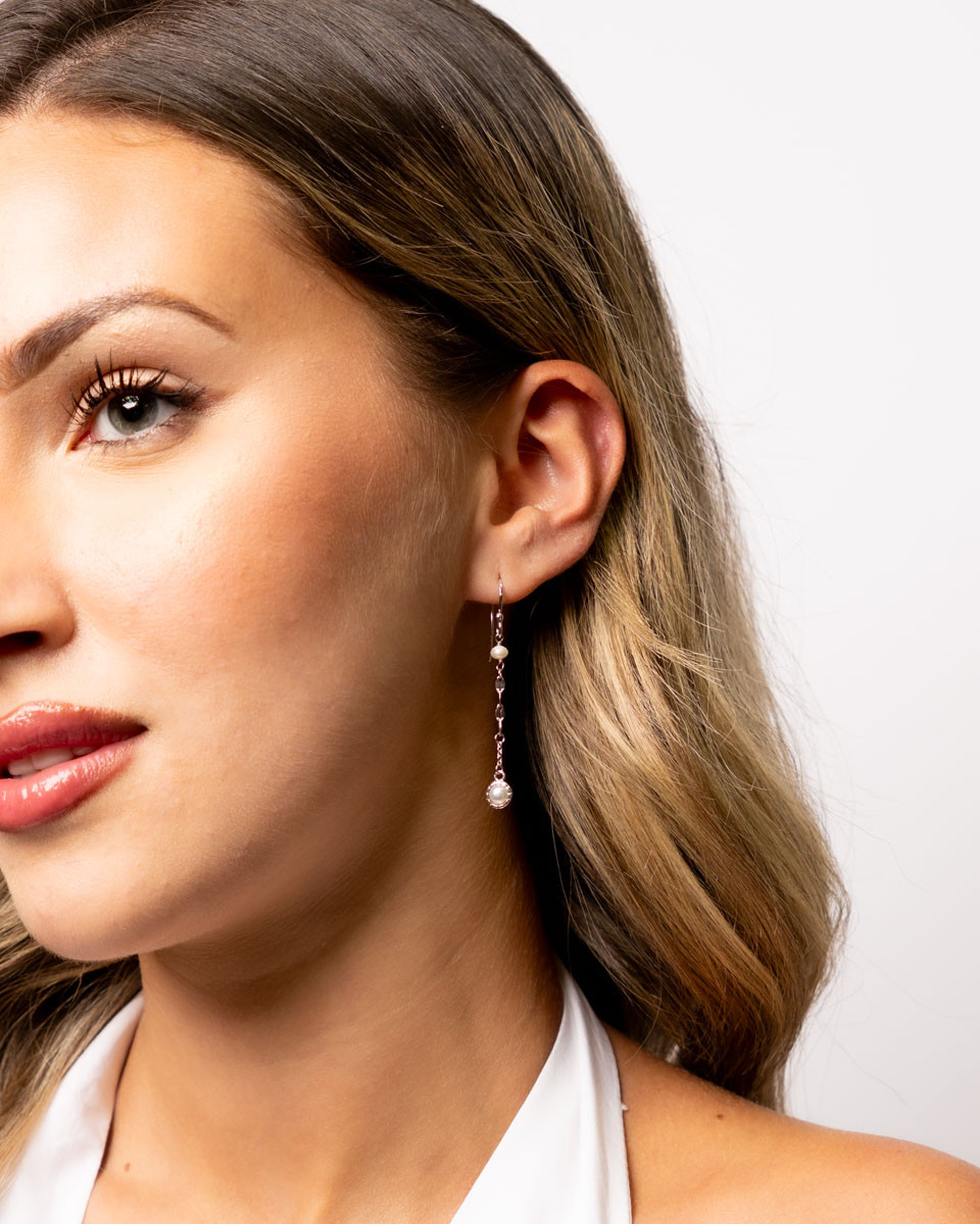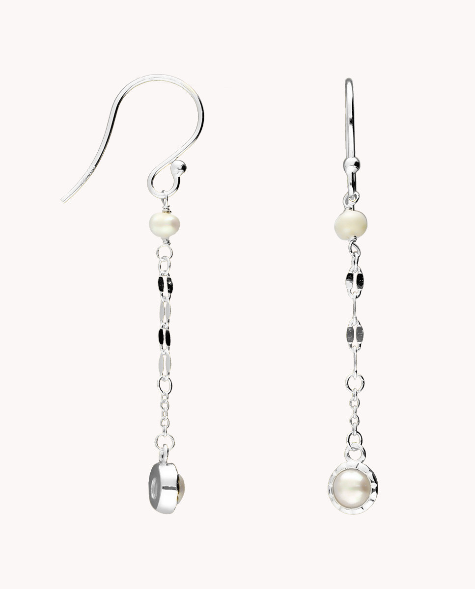 Pendientes largos de plata de ley 925 bañada en rodio con perla cultivada de 3mm, cadena de 3,5 cms y al final perla engastada de 3 mm, cierre de gancho