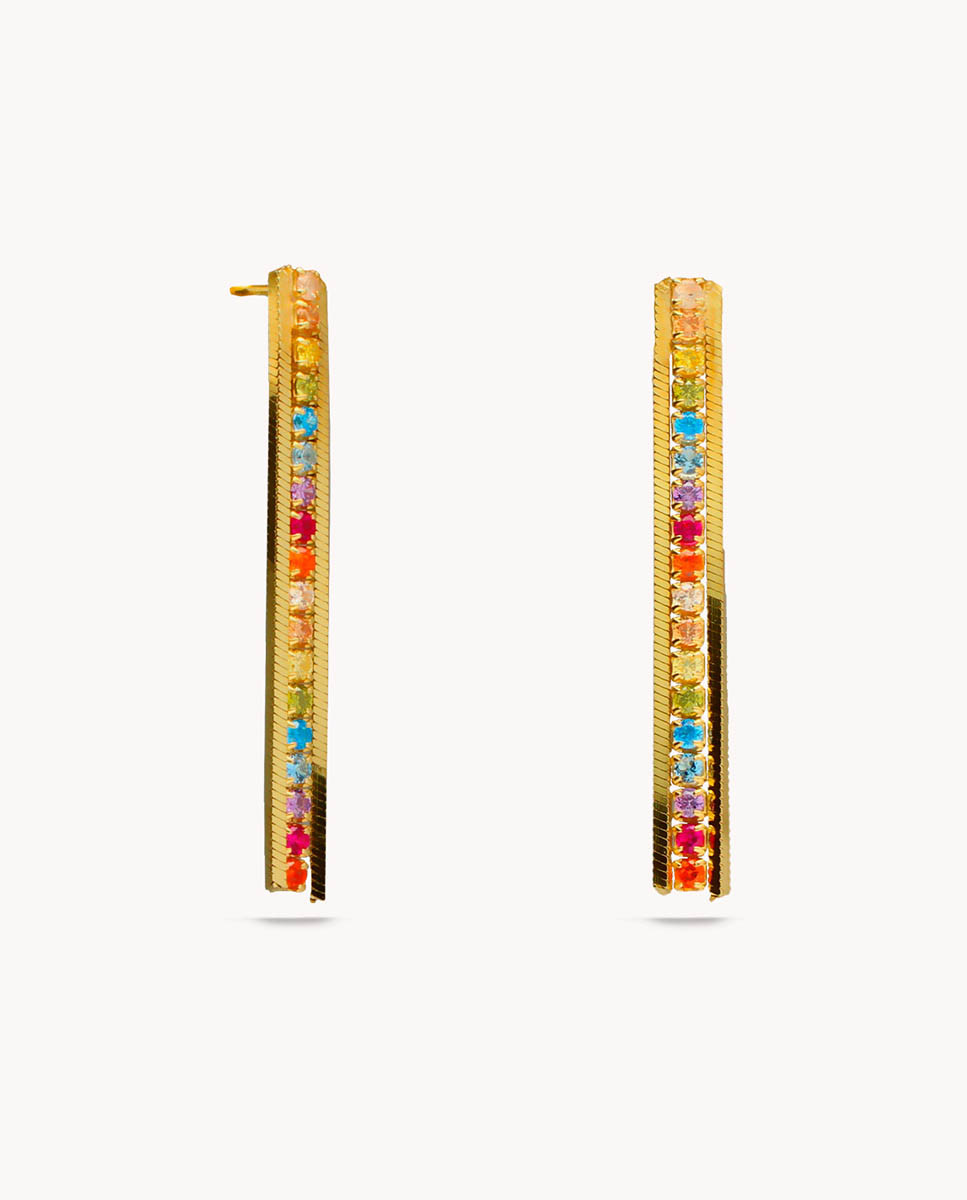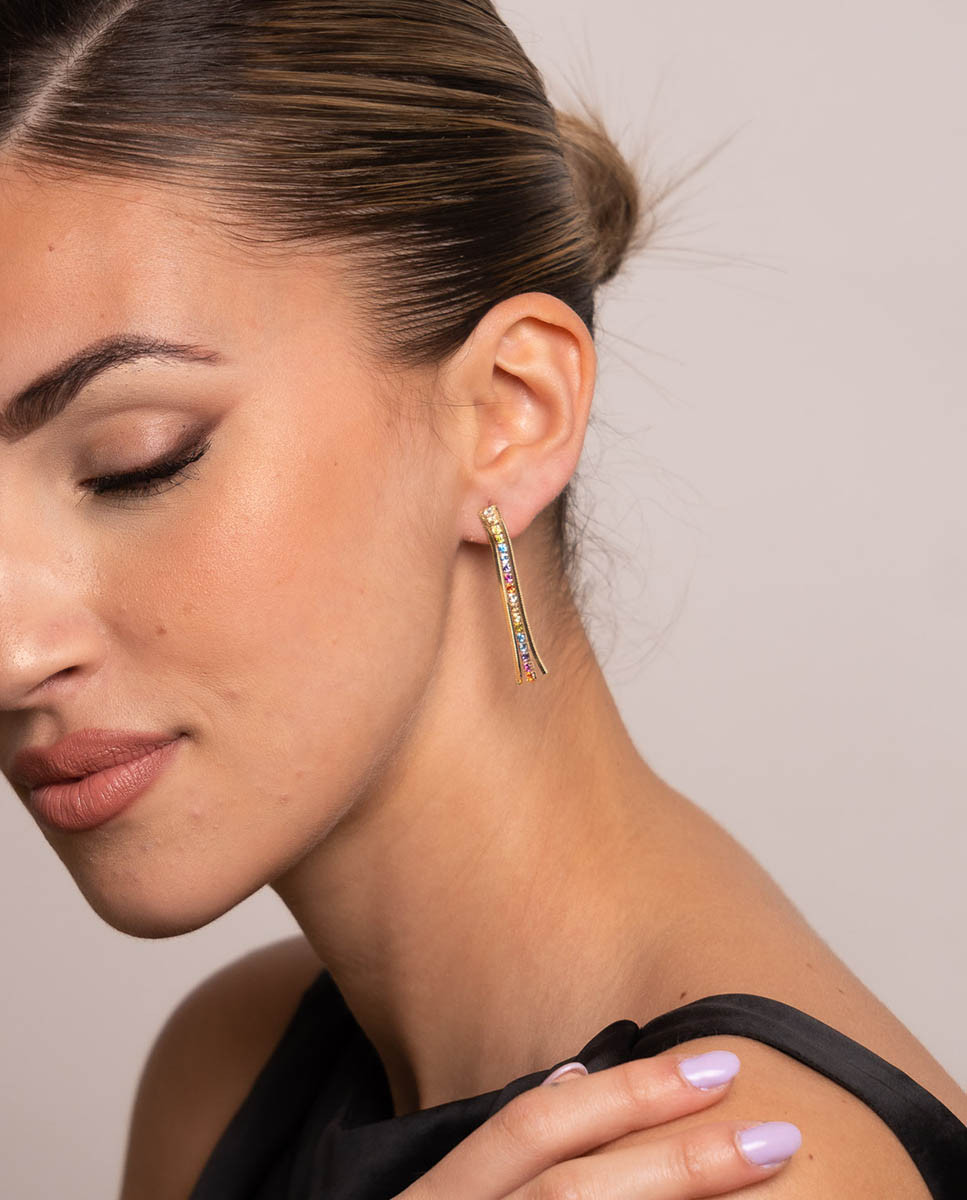Pendientes de plata de ley 925 bañada en oro 18k con una tira central de circonitas multicolor y dos cadenas laterales de 4 cms de largo, cierre de presión.