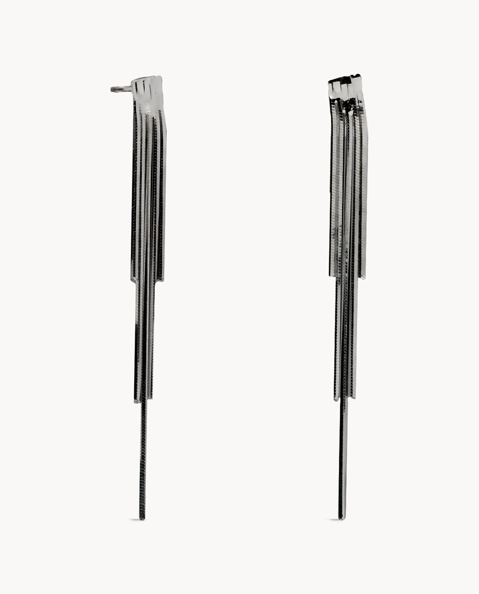 Pendientes de plata de ley 925 bañada en rodio con cinco cadenas en diferentes alturas, de 2,5 cms a 5 cms de largo y cierre de presión.