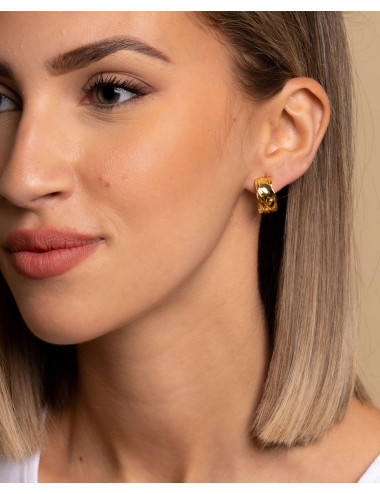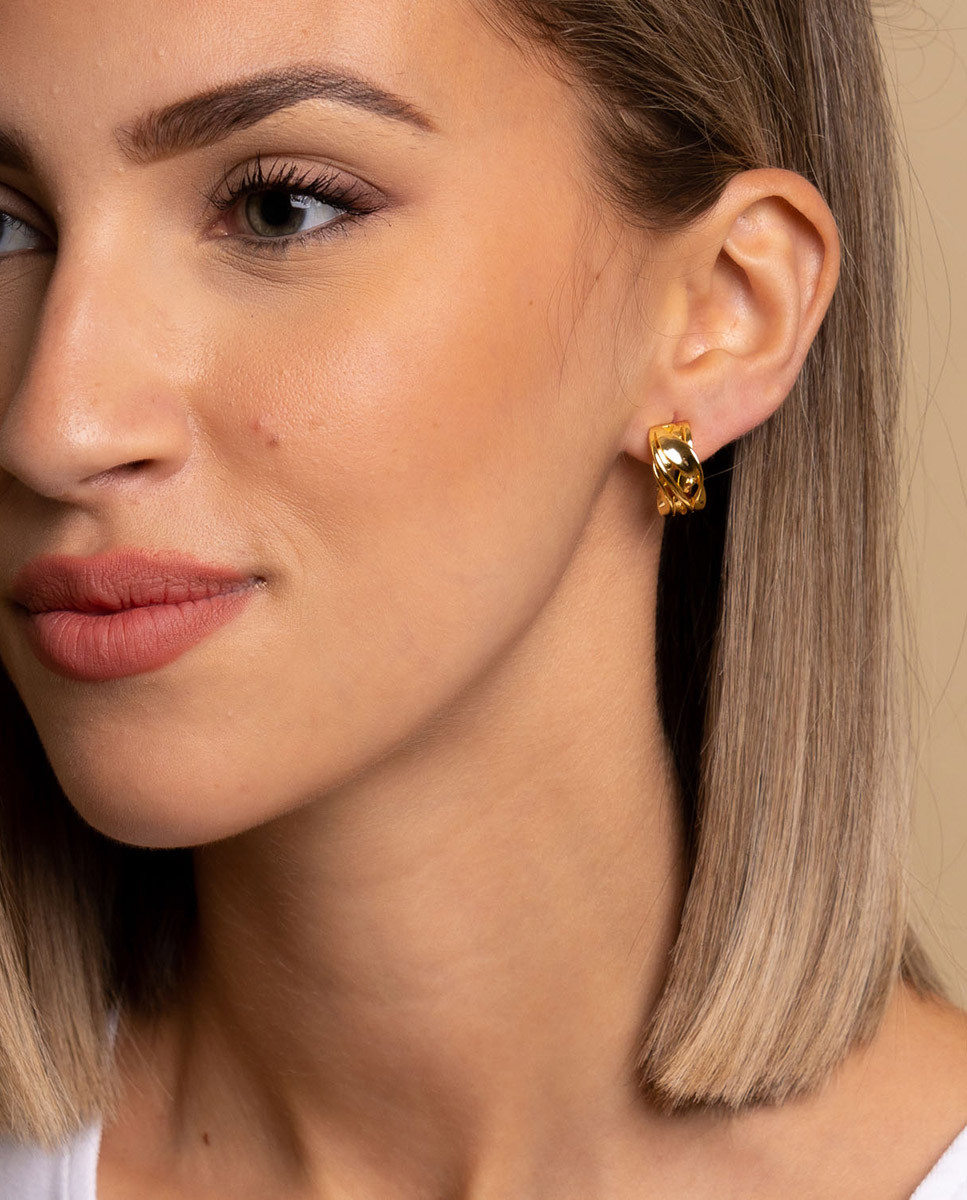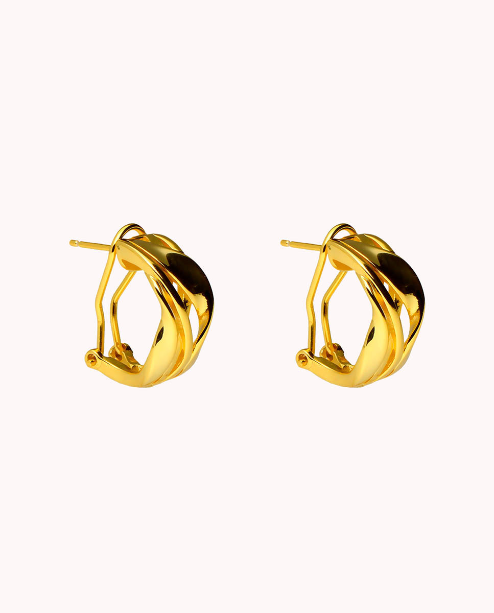 Pendientes de plata de ley 925 bañada en oro con diseño cruzado y cierre tipo omega.