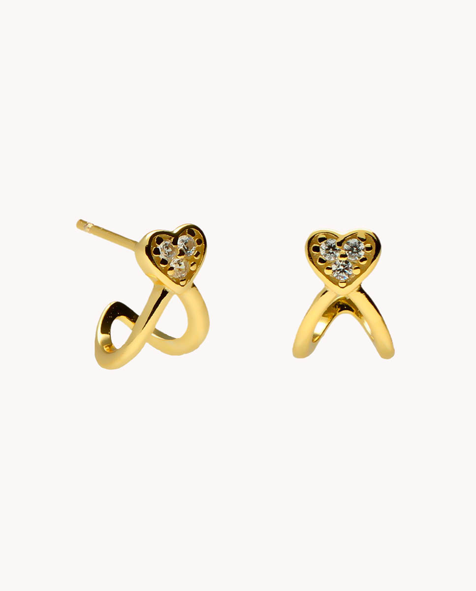 Pendientes ear jackets de plata de ley 925 bañados en oro con forma de corazón y circonitas blancas, cierre de presión.