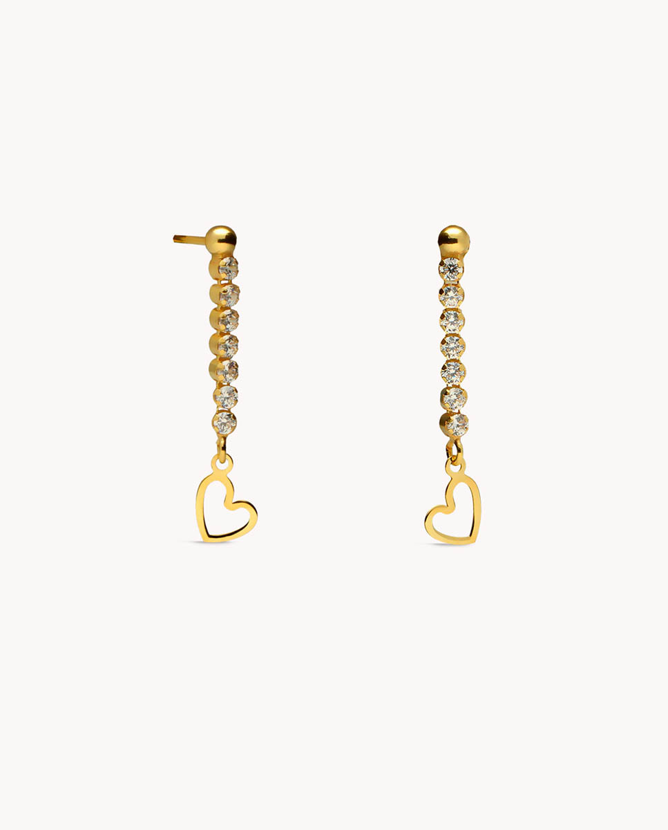 Pendientes de plata de ley 925 bañada en oro 18K con tira de circonitas blancas de 2 mm de diámetro y silueta de corazón en el final, largo de 3 cms y cierre de presión.