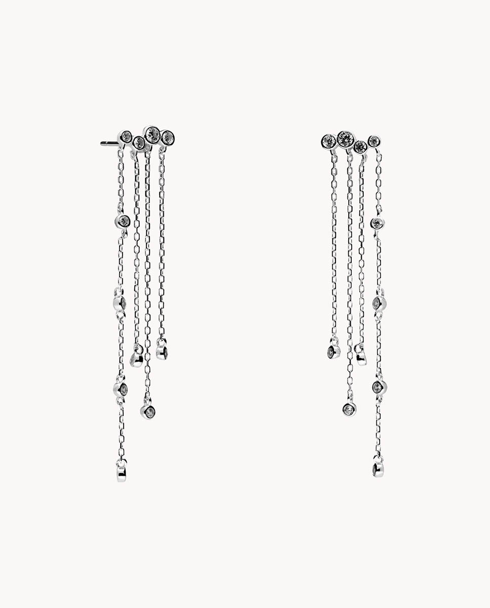 Pendientes de plata de ley 925 bañada en rodio con barra de 12 mm de largo y cuatro circonitas blancas de 4 mm y 3 mm de diámetro, cadenas de 4 cms, 4,5 cms, 5 cms y 6 cms con detalle de circonitas blancas y cierre de presión.