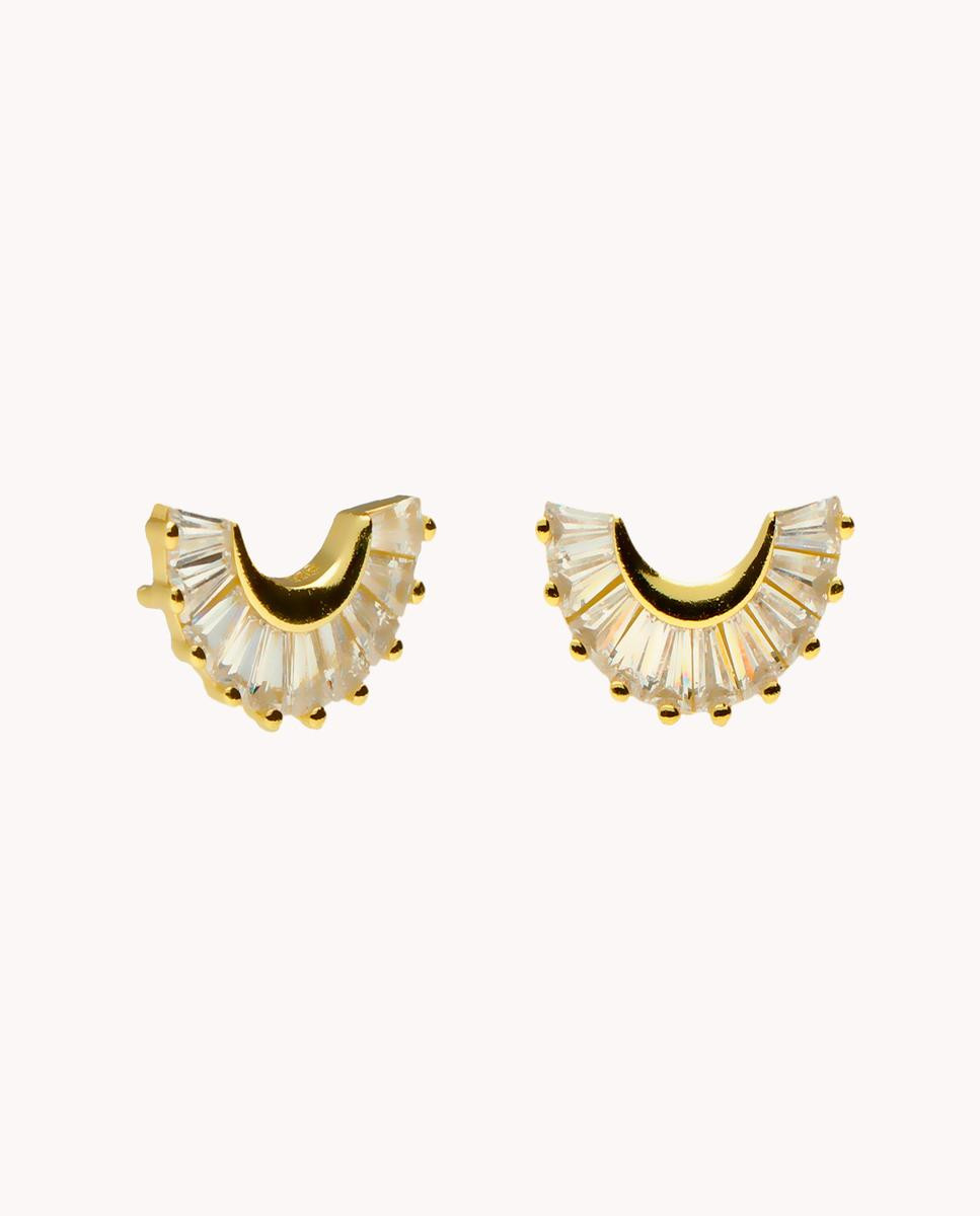 Pendientes de plata de ley 925 bañada en oro con forma de medio sol de 12 mm de ancho con circonitas talla baguette, cierre de presión.