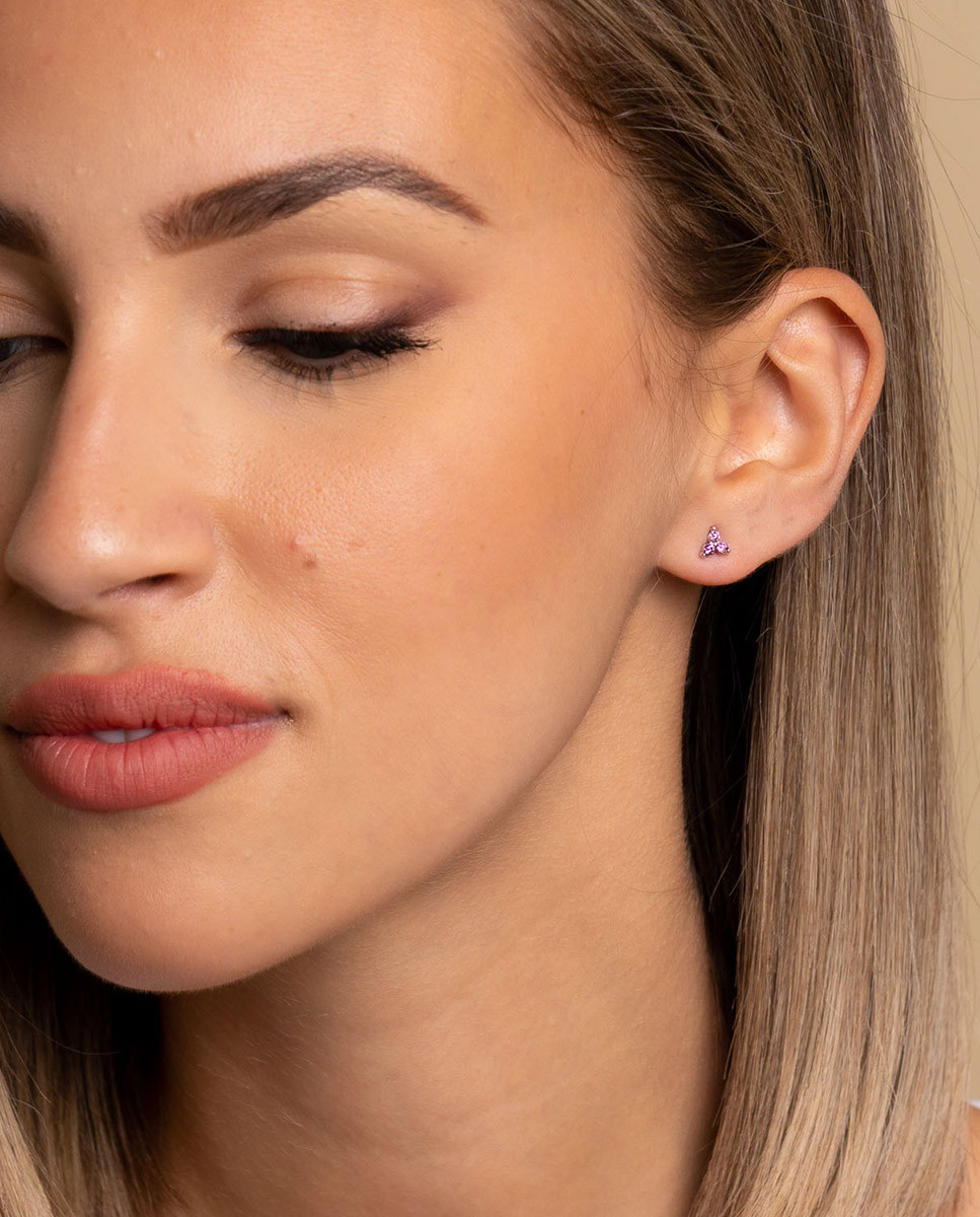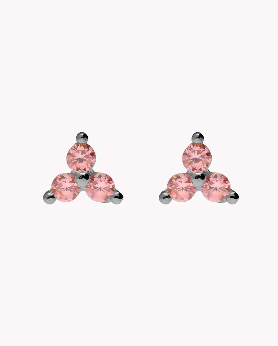Pendientes de plata de ley 925 bañada en rodio con tres circonitas rosas de 2 mm y cierre de presión.